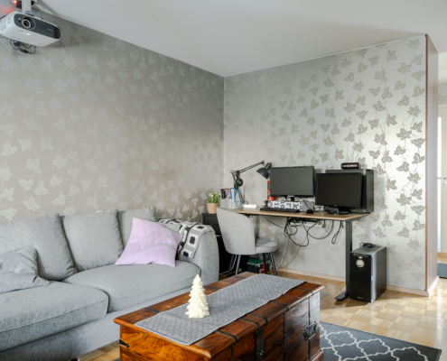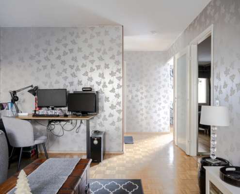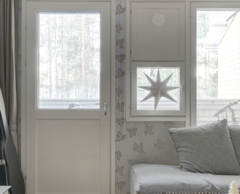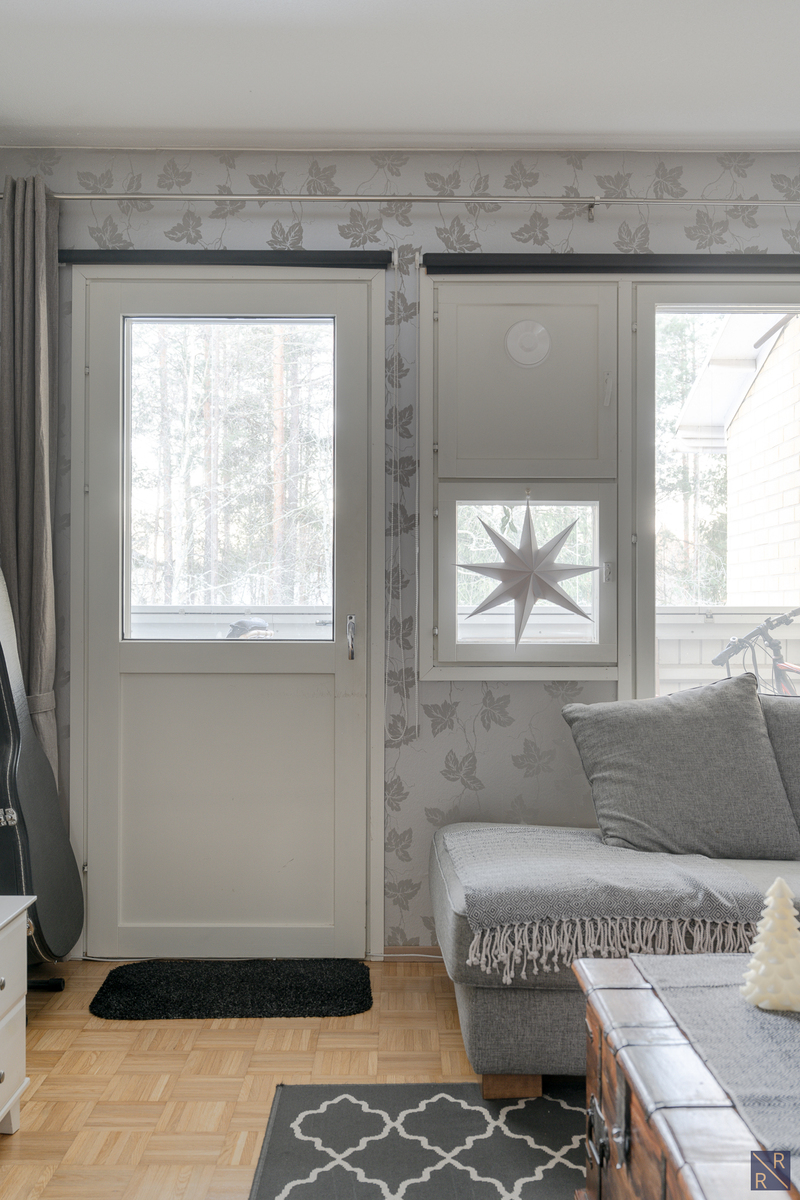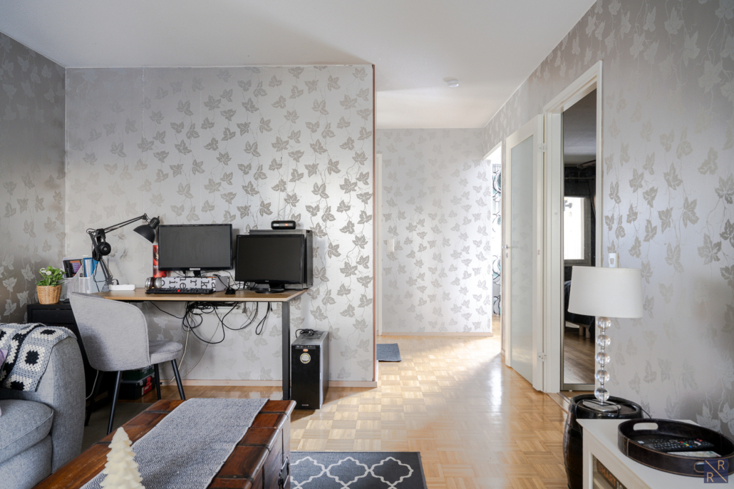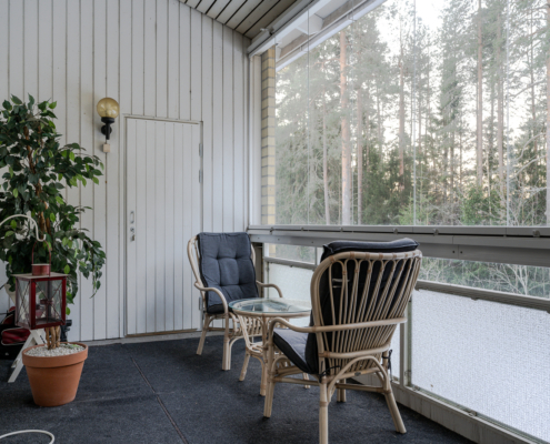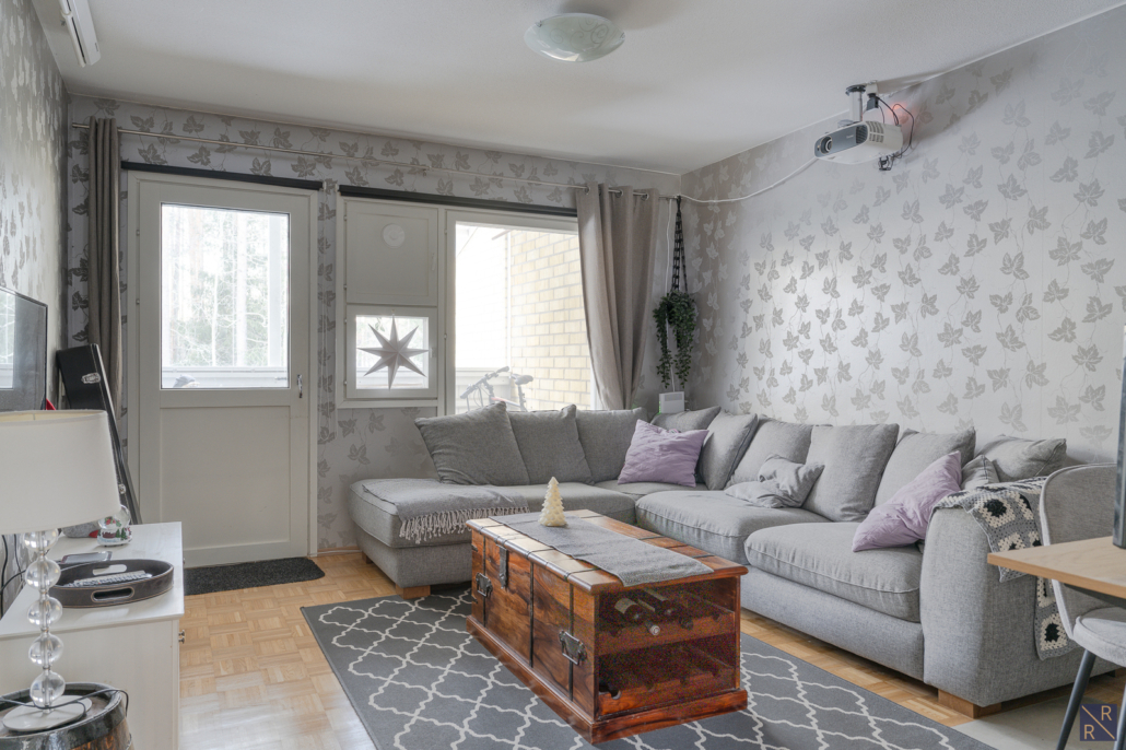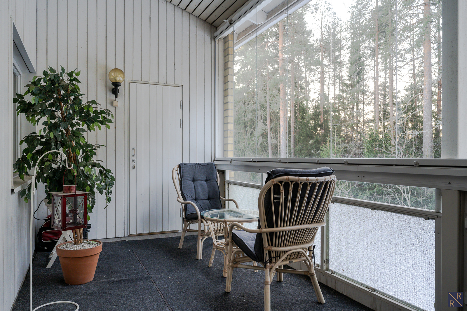 Asunnon huoneet ovat reilun kokoisia. Suuri olohuone mahdollistaa monipuoliset sisustusratkaisut ja tilaa jää hyvin myös työpisteelle. Olohuoneesta on käynti lasitetulle parvekkeelle, jolta avautuvat puistomaiset näkymät. Parvekkeelta löytyy lisäksi kätevä irtainvarasto.