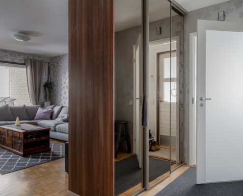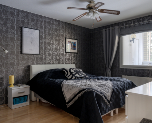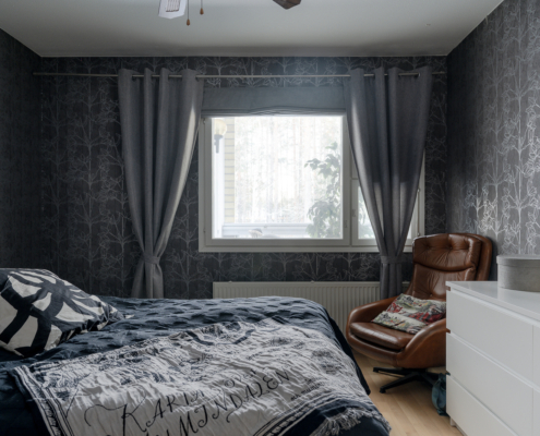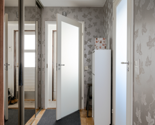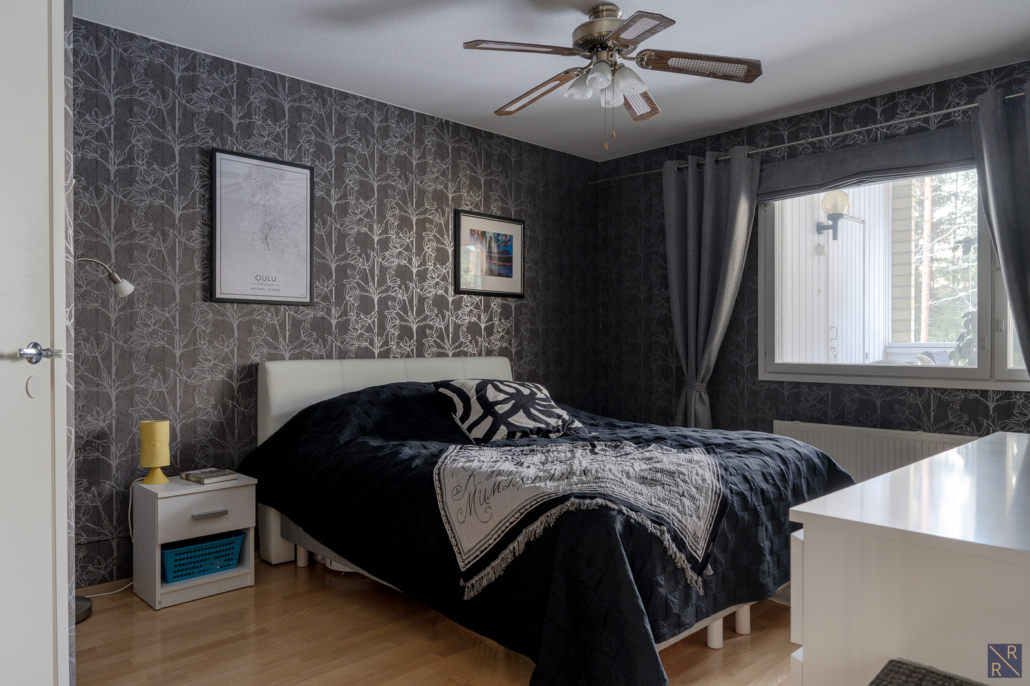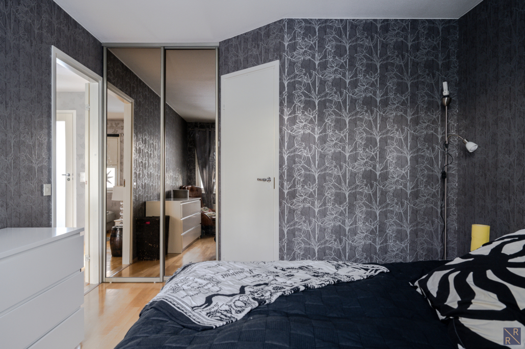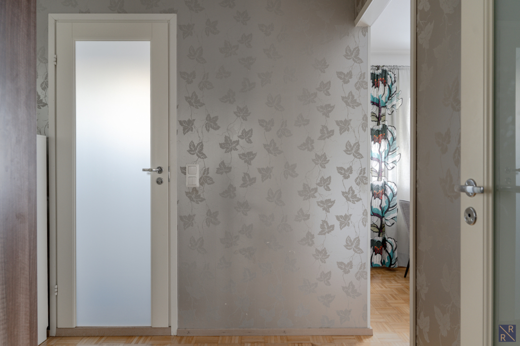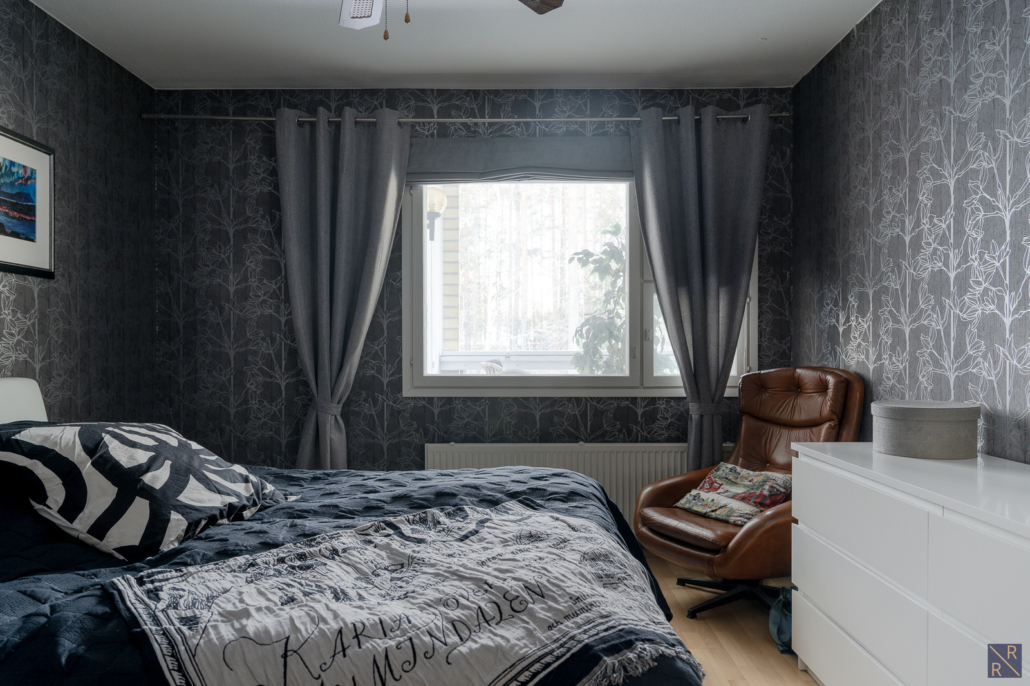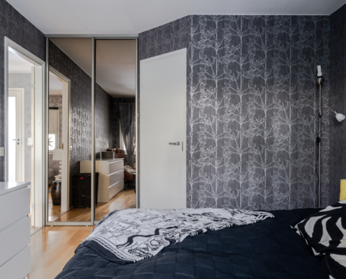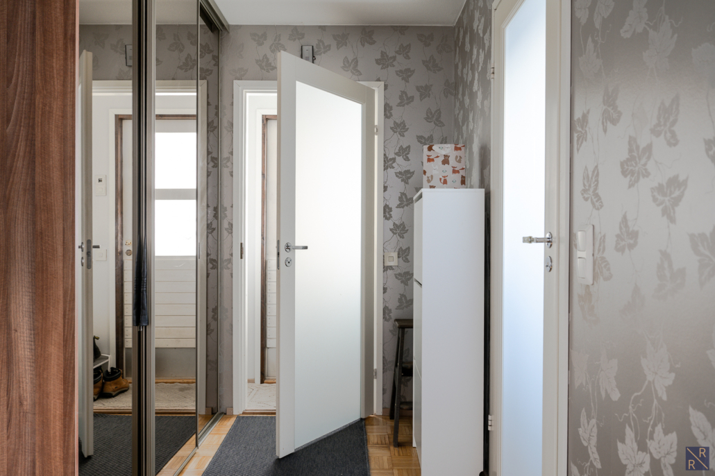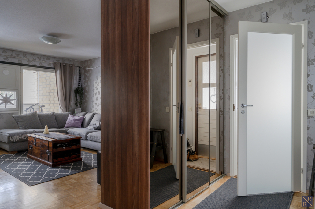 Makuuhuone on tilava ja säilytysratkaisut ovat erinomaiset: käytössäsi on sekä vaatehuone että liukupeilikaapistot. Myös eteisessä on mukavasti lisätilaa säilytykselle.
