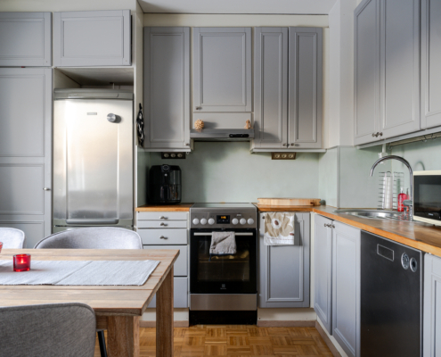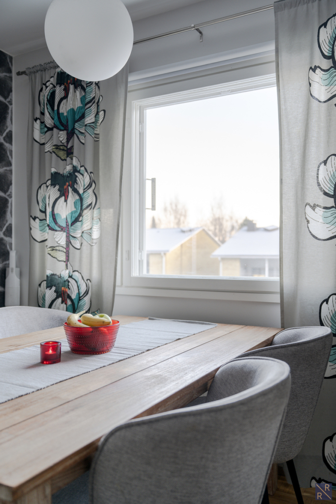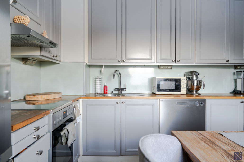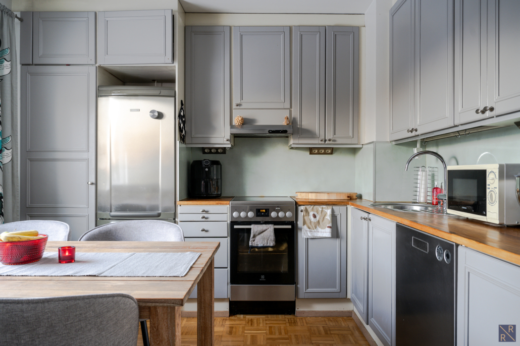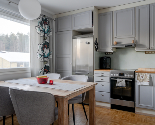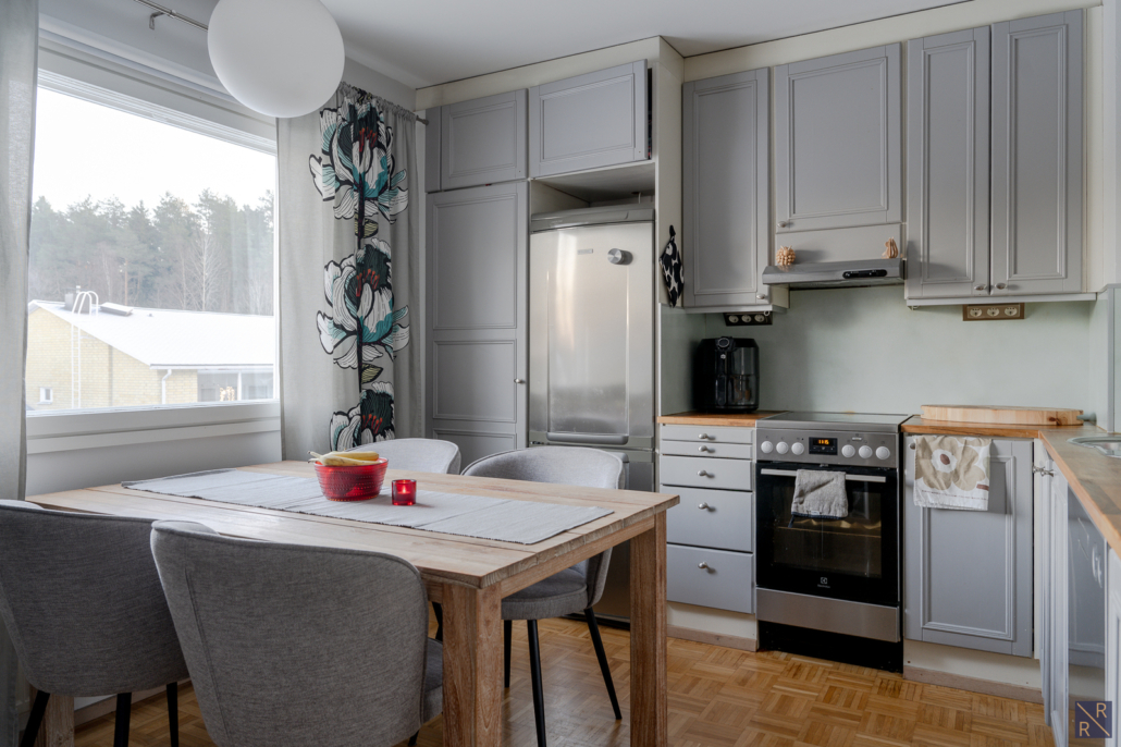 Erillinen keittiö tarjoaa runsaasti työtaso- ja kaappitilaa ja ruokapöydälle on oma luonteva paikkansa ikkunan ääressä, näkymien avautuessa etupihalle. Keittiö toimii erinomaisesti niin arjessa kuin juhlassa.