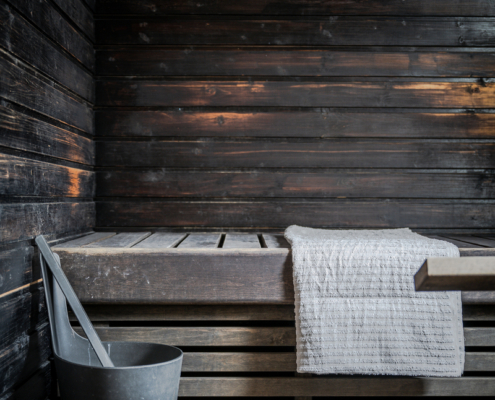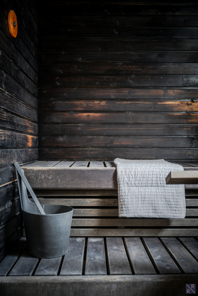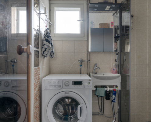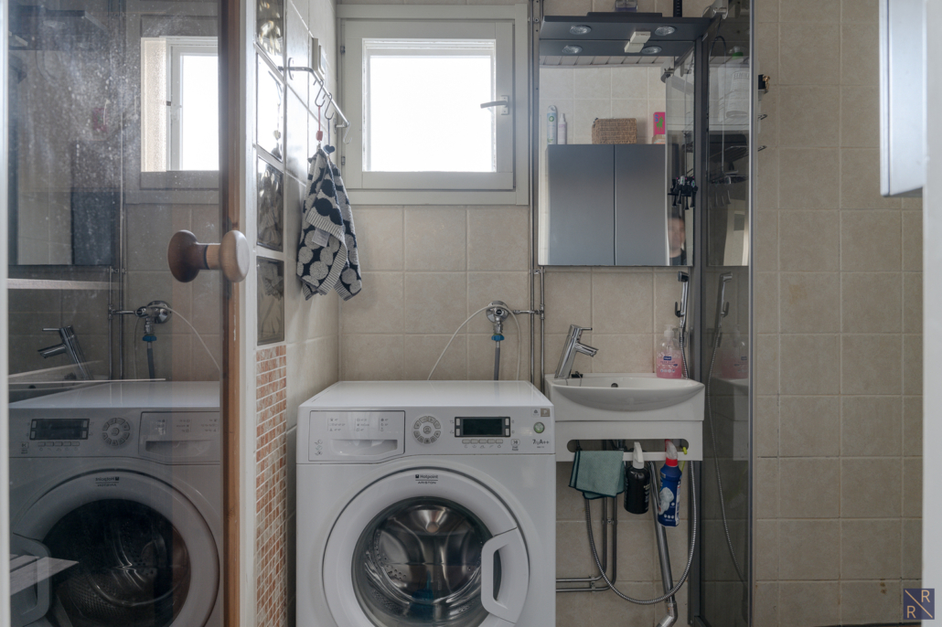 Oma sauna ikkunalla tuo arkeen rentouttavia hetkiä ja kylpyhuone on suunniteltu käytännöllisyyttä ajatellen – suihkunurkassa liukuvat suihkuseinät rajaavat roiskeet ja pyykkikoneelle on oma paikka ja liitäntä.