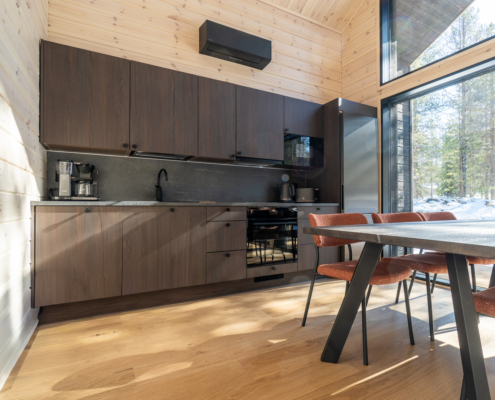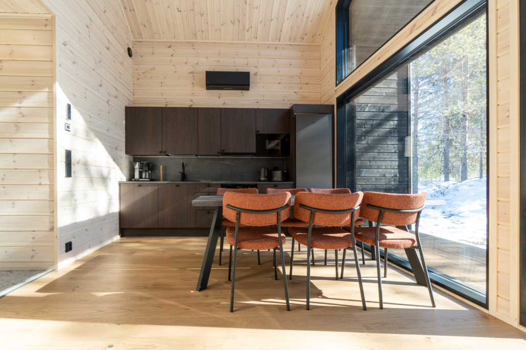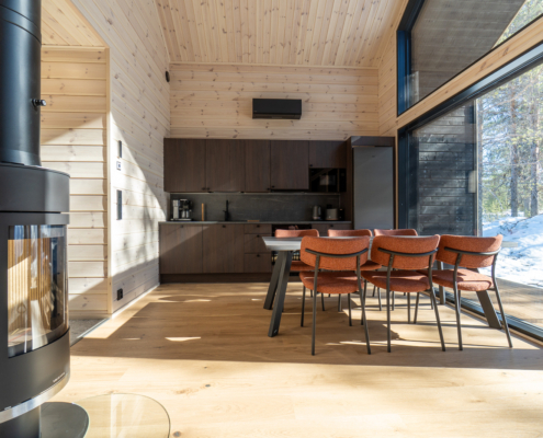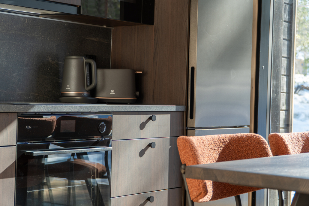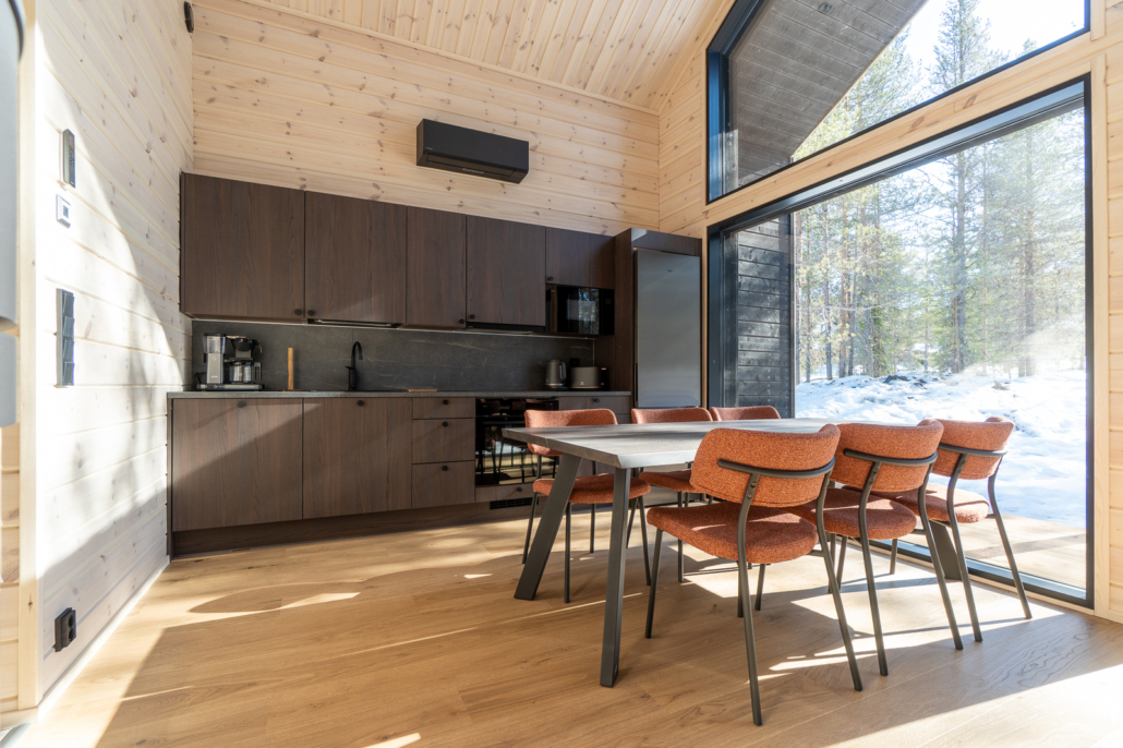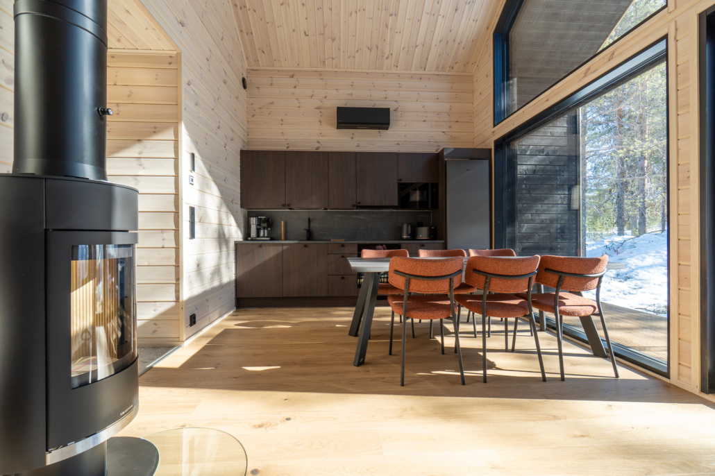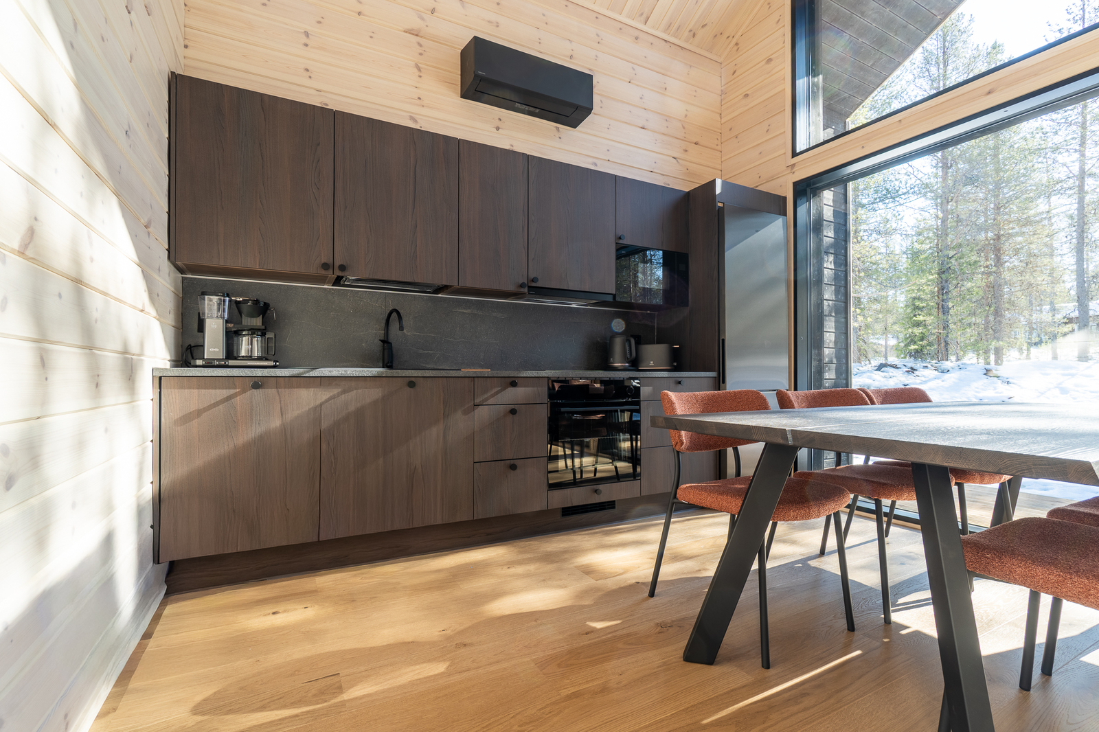 Kodin näyttävä sydän on avara oleskelutila, jossa keittiö ja olohuone sulautuvat harmoniseksi kokonaisuudeksi. Harjaansa korotettu katto ja suuret ikkunapinnat tuovat tilaan runsaasti luonnonvaloa ja nostavat ympäröivän Lapin maiseman osaksi sisustusta. Seinien kauniit hirsipaneelit luovat lämpimän ja autenttisen tunnelman, joka yhdistyy tyylikkäästi moderniin ilmeeseen. Tummasävyinen, laadukkaasti varusteltu keittiö tuo kokonaisuuteen eleganttia kontrastia. Olohuoneessa kevyttakka luo pehmeää tunnelmaa ja ilmalämpöpumppu lisää asumismukavuutta ympäri vuoden.