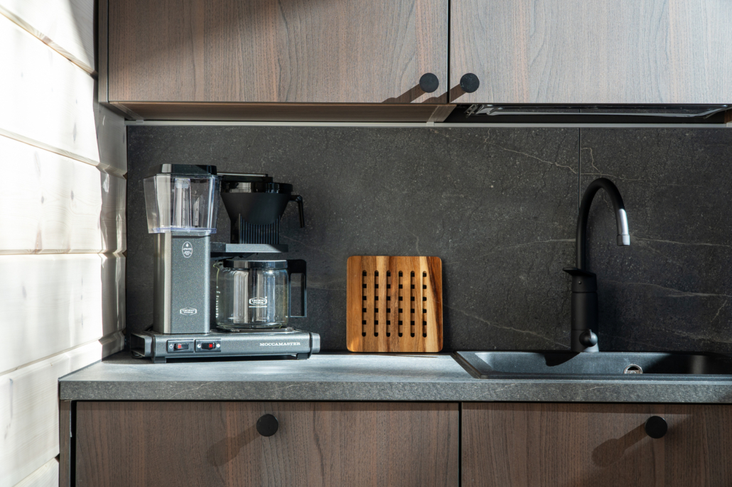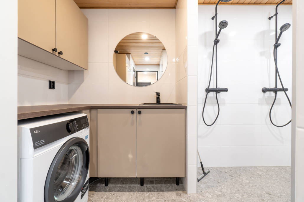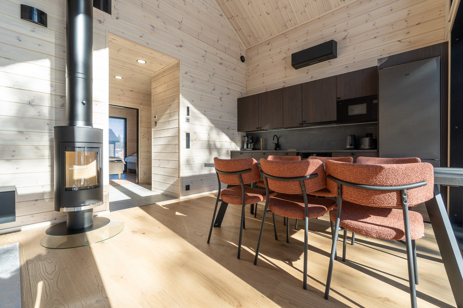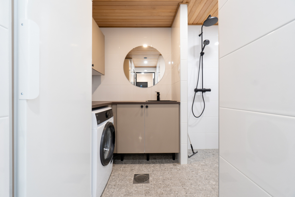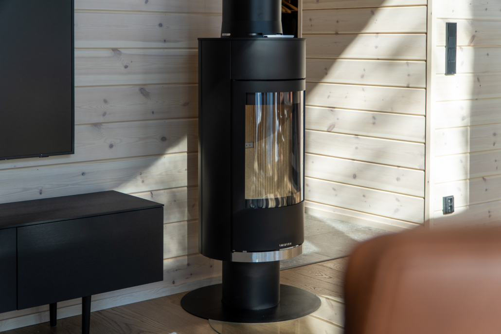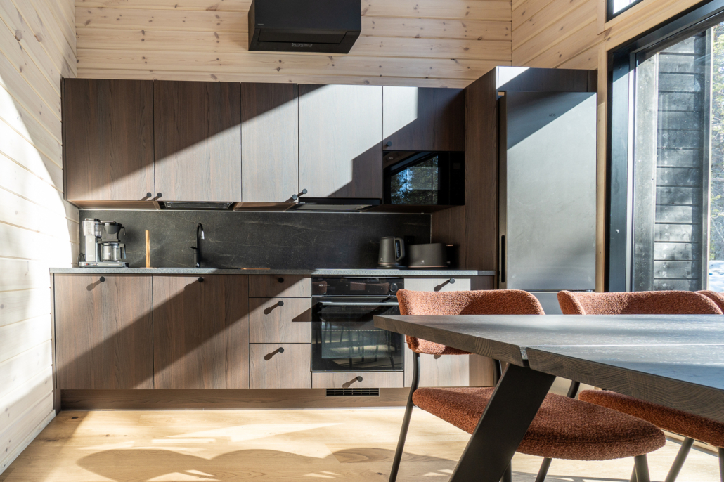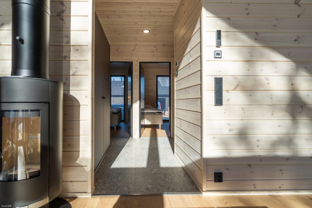 Kodin näyttävä sydän on avara oleskelutila, jossa keittiö ja olohuone sulautuvat harmoniseksi kokonaisuudeksi. Harjaansa korotettu katto ja suuret ikkunapinnat tuovat tilaan runsaasti luonnonvaloa ja nostavat ympäröivän Lapin maiseman osaksi sisustusta. Seinien kauniit hirsipaneelit luovat lämpimän ja autenttisen tunnelman, joka yhdistyy tyylikkäästi moderniin ilmeeseen. Tummasävyinen, laadukkaasti varusteltu keittiö tuo kokonaisuuteen eleganttia kontrastia. Olohuoneessa kevyttakka luo pehmeää tunnelmaa ja ilmalämpöpumppu lisää asumismukavuutta ympäri vuoden.