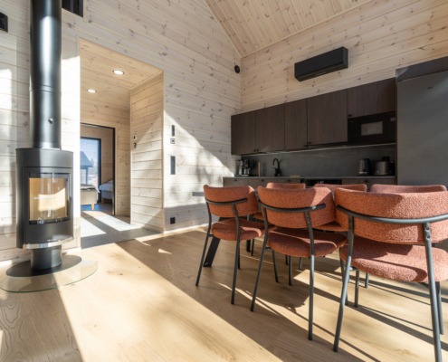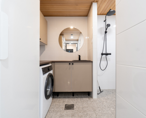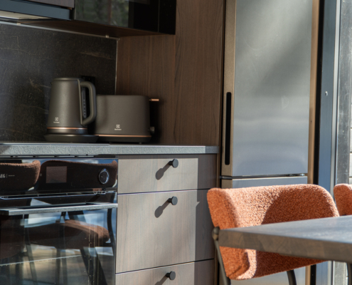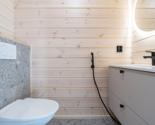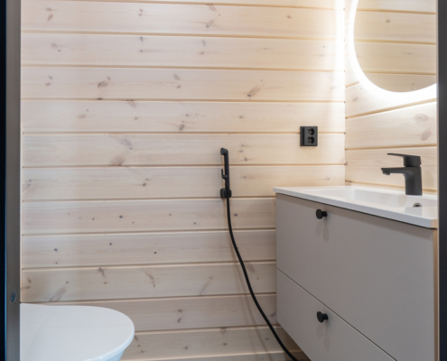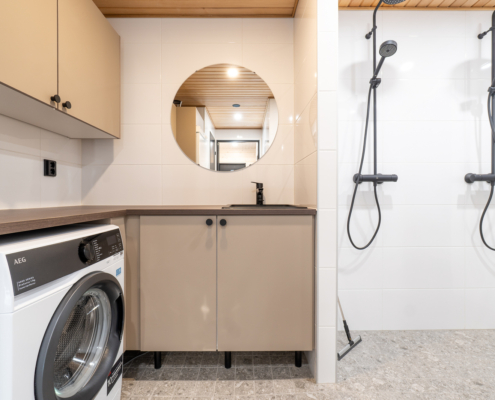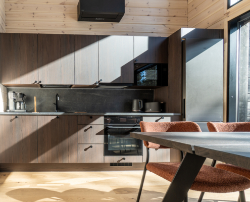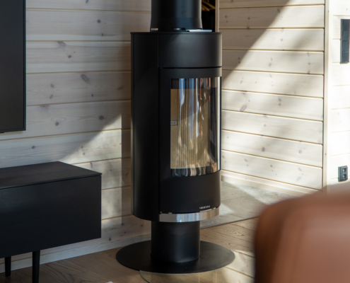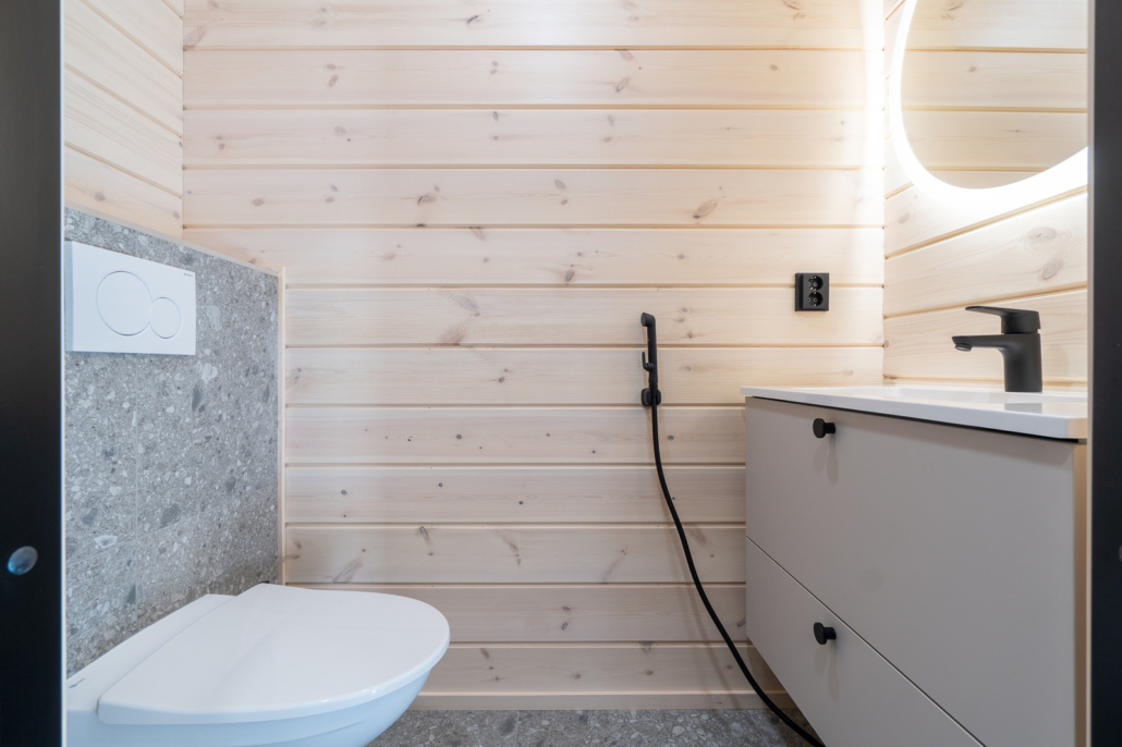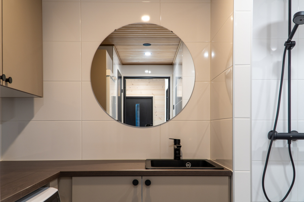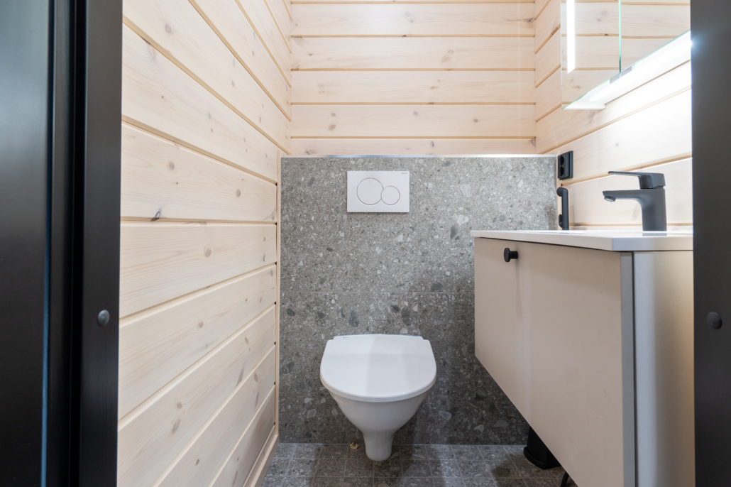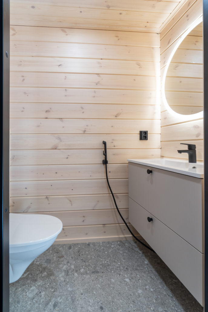 Kodin näyttävä sydän on avara oleskelutila, jossa keittiö ja olohuone sulautuvat harmoniseksi kokonaisuudeksi. Harjaansa korotettu katto ja suuret ikkunapinnat tuovat tilaan runsaasti luonnonvaloa ja nostavat ympäröivän Lapin maiseman osaksi sisustusta. Seinien kauniit hirsipaneelit luovat lämpimän ja autenttisen tunnelman, joka yhdistyy tyylikkäästi moderniin ilmeeseen. Tummasävyinen, laadukkaasti varusteltu keittiö tuo kokonaisuuteen eleganttia kontrastia. Olohuoneessa kevyttakka luo pehmeää tunnelmaa ja ilmalämpöpumppu lisää asumismukavuutta ympäri vuoden.