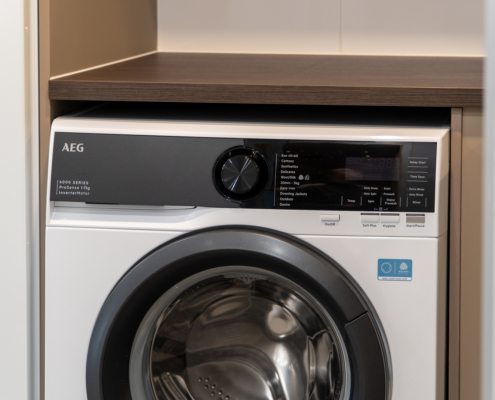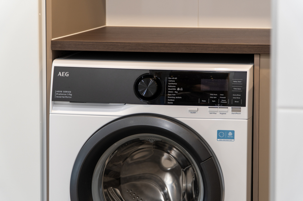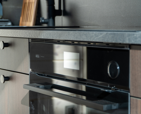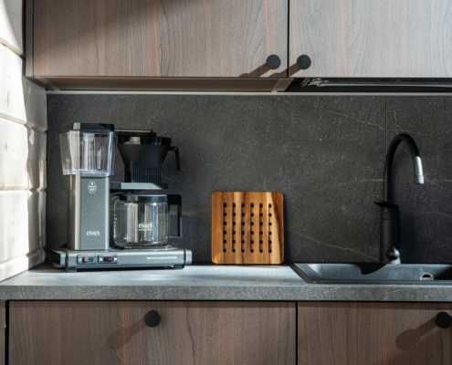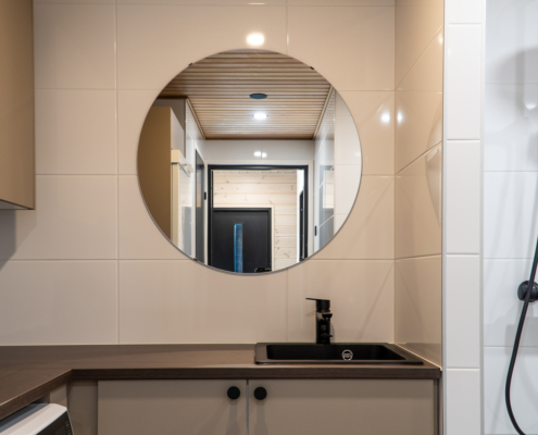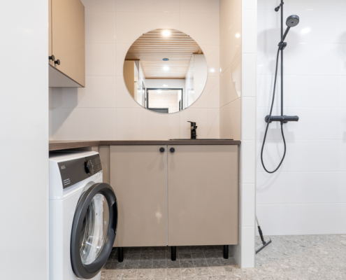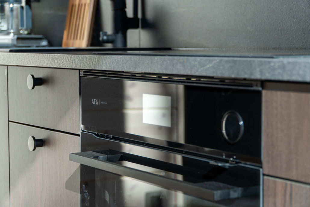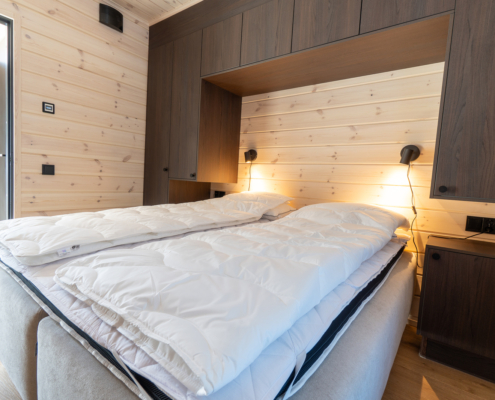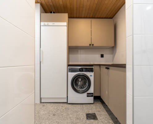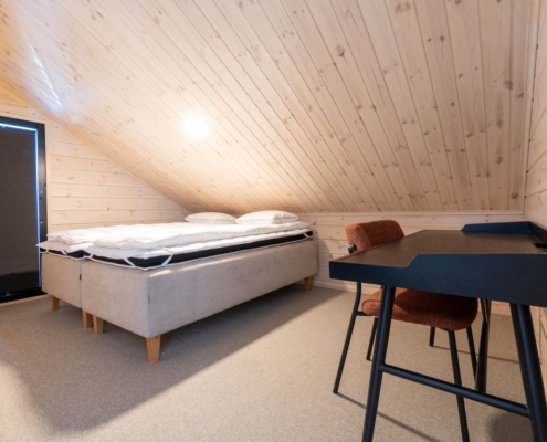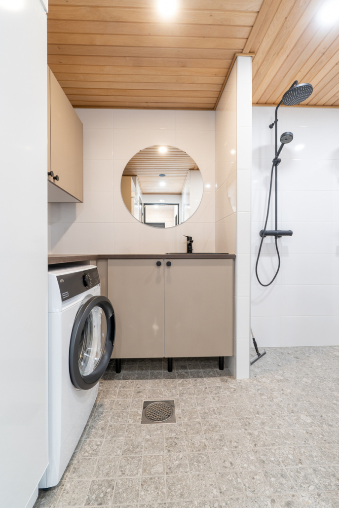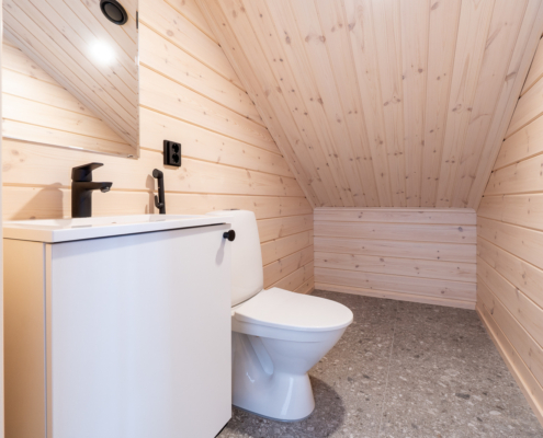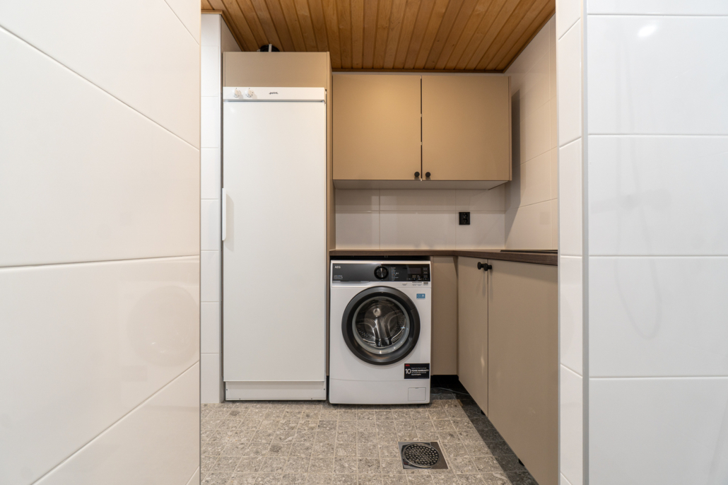 Kodin näyttävä sydän on avara oleskelutila, jossa keittiö ja olohuone sulautuvat harmoniseksi kokonaisuudeksi. Harjaansa korotettu katto ja suuret ikkunapinnat tuovat tilaan runsaasti luonnonvaloa ja nostavat ympäröivän Lapin maiseman osaksi sisustusta. Seinien kauniit hirsipaneelit luovat lämpimän ja autenttisen tunnelman, joka yhdistyy tyylikkäästi moderniin ilmeeseen. Tummasävyinen, laadukkaasti varusteltu keittiö tuo kokonaisuuteen eleganttia kontrastia. Olohuoneessa kevyttakka luo pehmeää tunnelmaa ja ilmalämpöpumppu lisää asumismukavuutta ympäri vuoden.