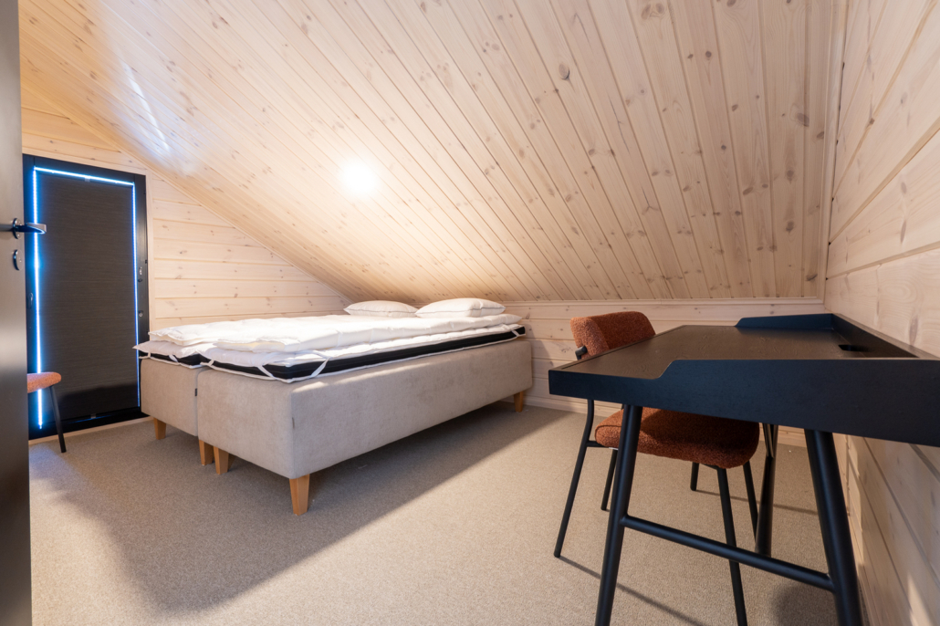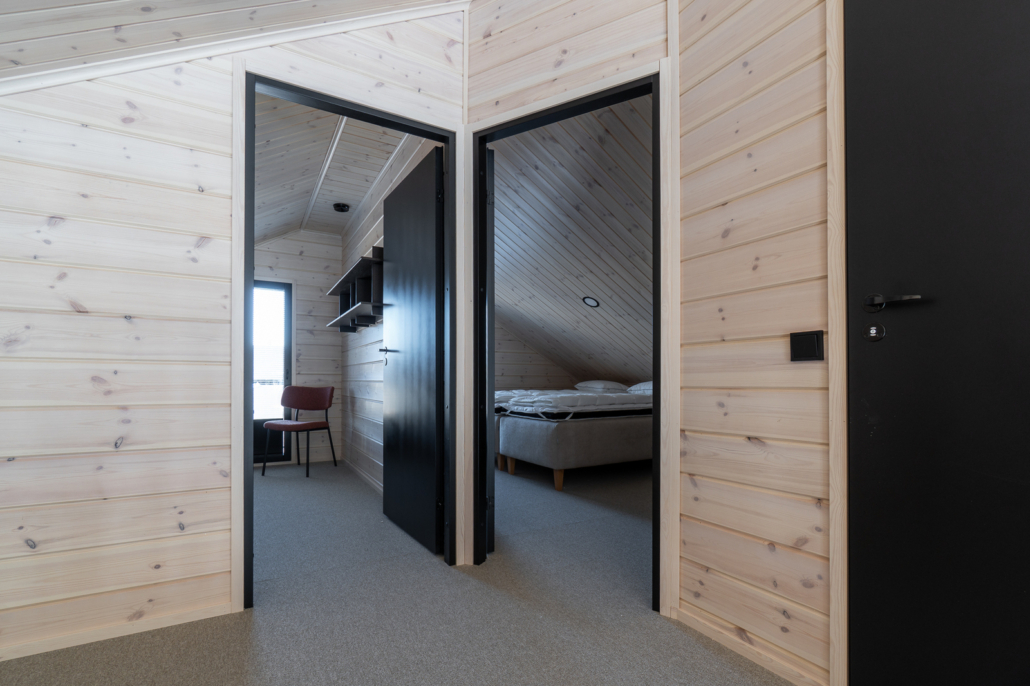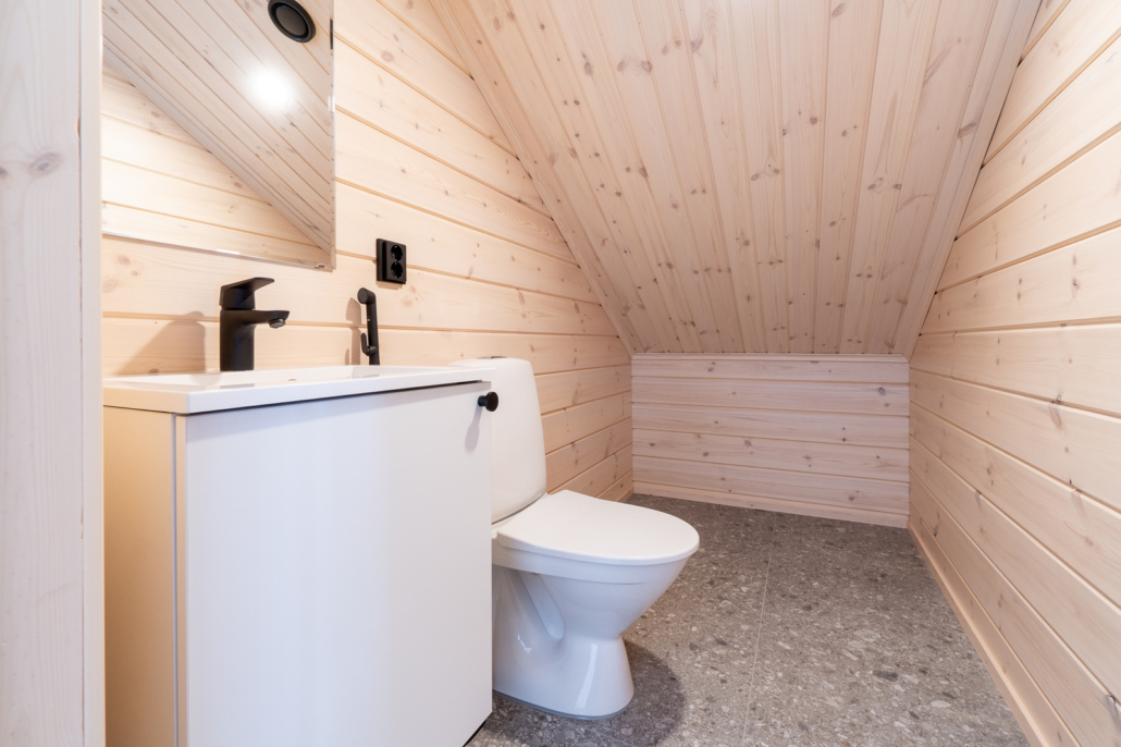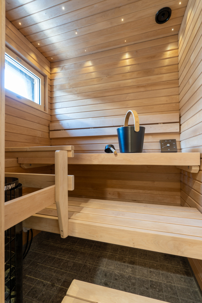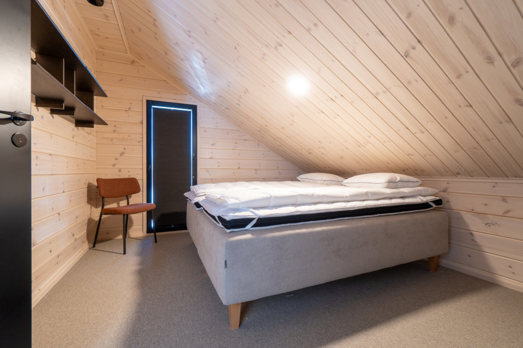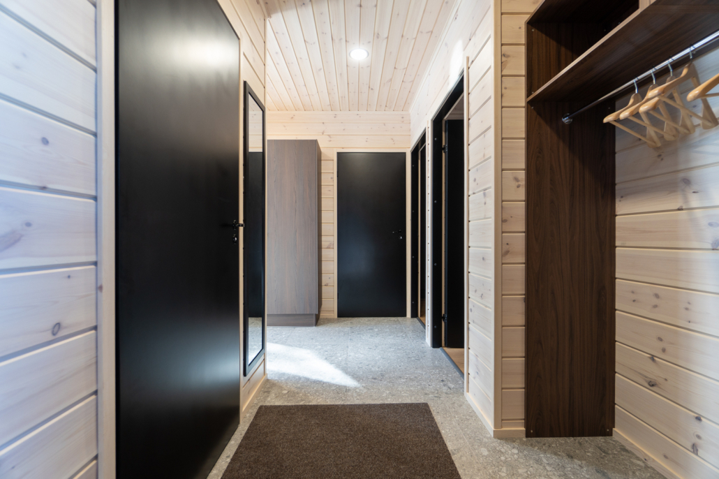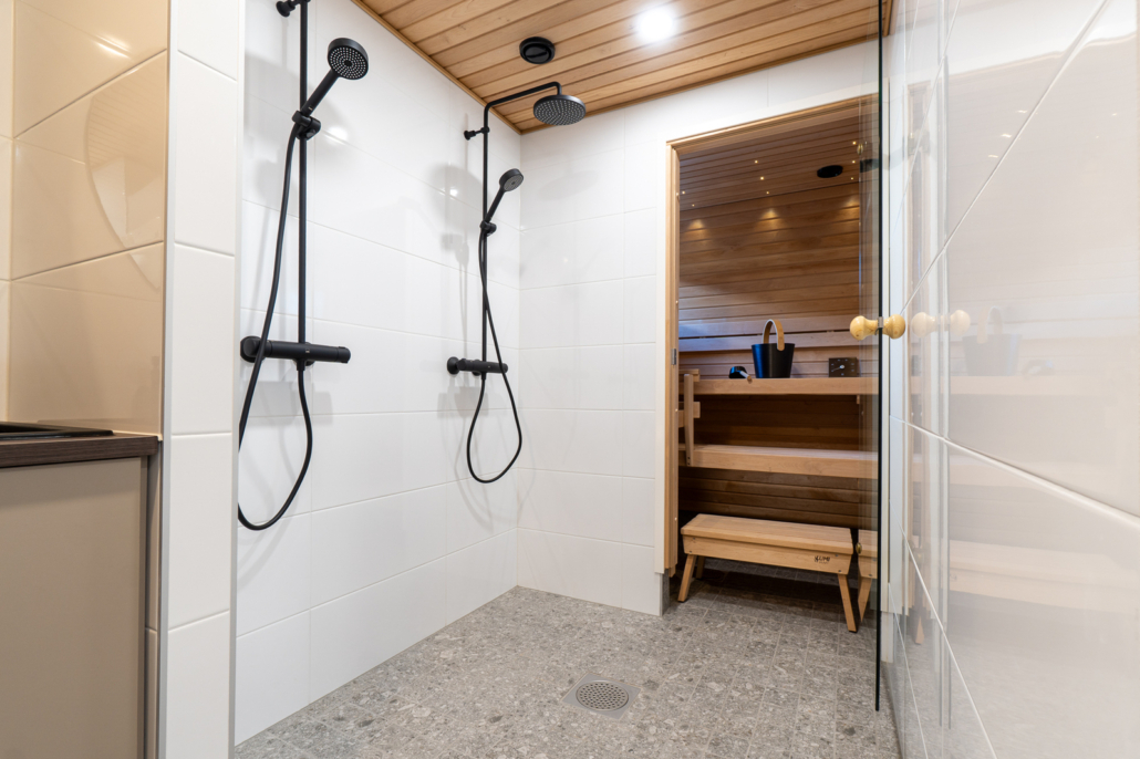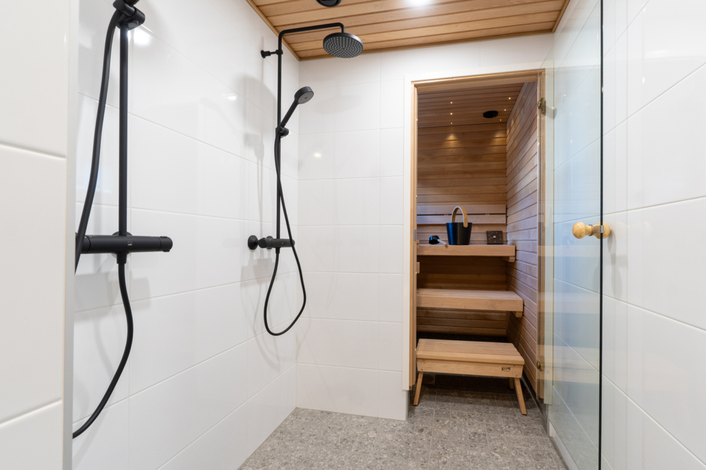 Tilat jakautuvat kahteen tasoon tarjoten erinomaiset puitteet isommallekin seurueelle. Parvikerroksessa sijaitsee kaksi makuuhuonetta sekä erillinen wc. Alakerrasta löytyvät lisäksi kaksi makuuhuonetta sekä upea saunaosasto, jossa kaksi sadesuihkua ja oma sauna kutsuvat rentoutumaan aktiivisen päivän jälkeen. Kodinhoitotila kuivauskaappeineen on suunniteltu erityisesti Lapin olosuhteisiin. Lisäksi alakerrassa on kaksi wc:tä.