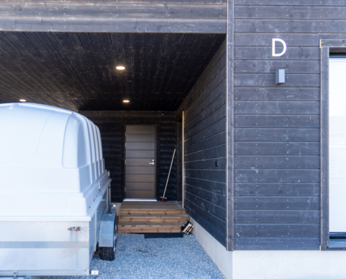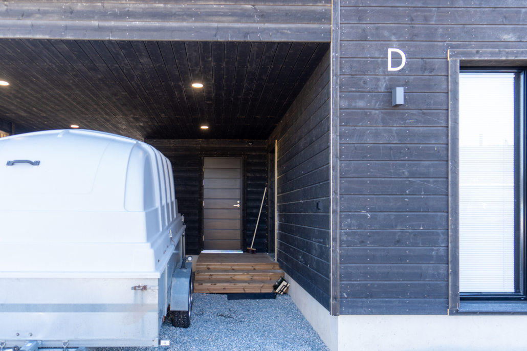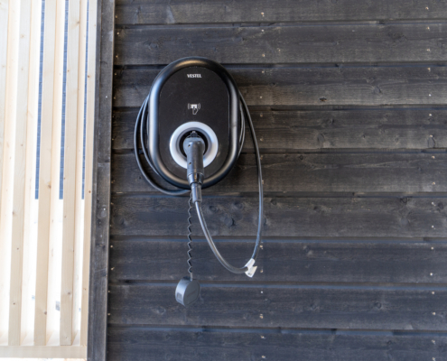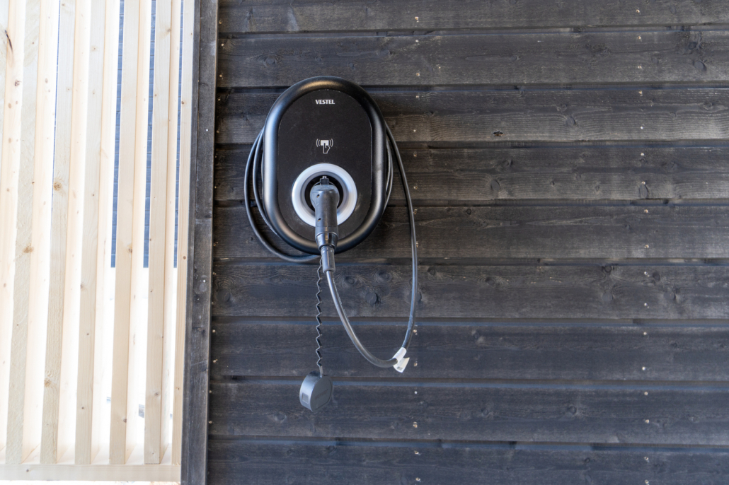 Asunnon edustalla sijaitseva autokatos on varustettu sähköauton latauspisteellä, tuoden arkeen modernia helppoutta.