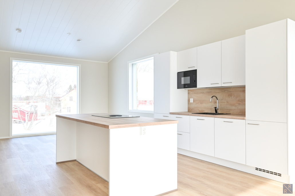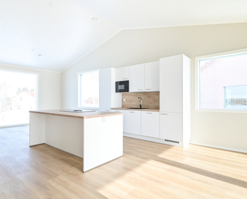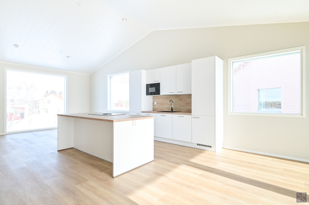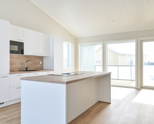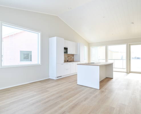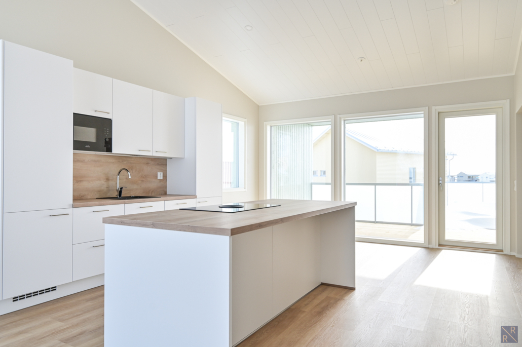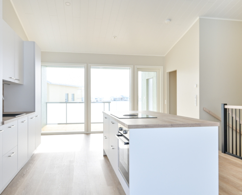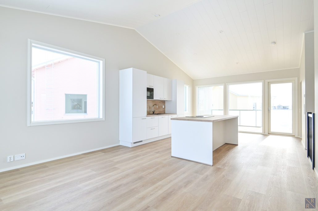 Olohuone ja keittiö yhtenäistä avaraa oleskelutilaa - sijoittuvat yläkertaan.