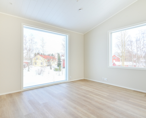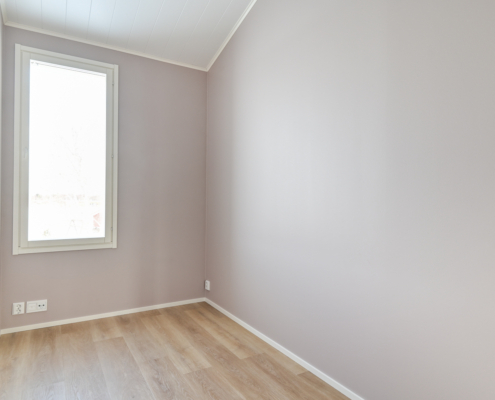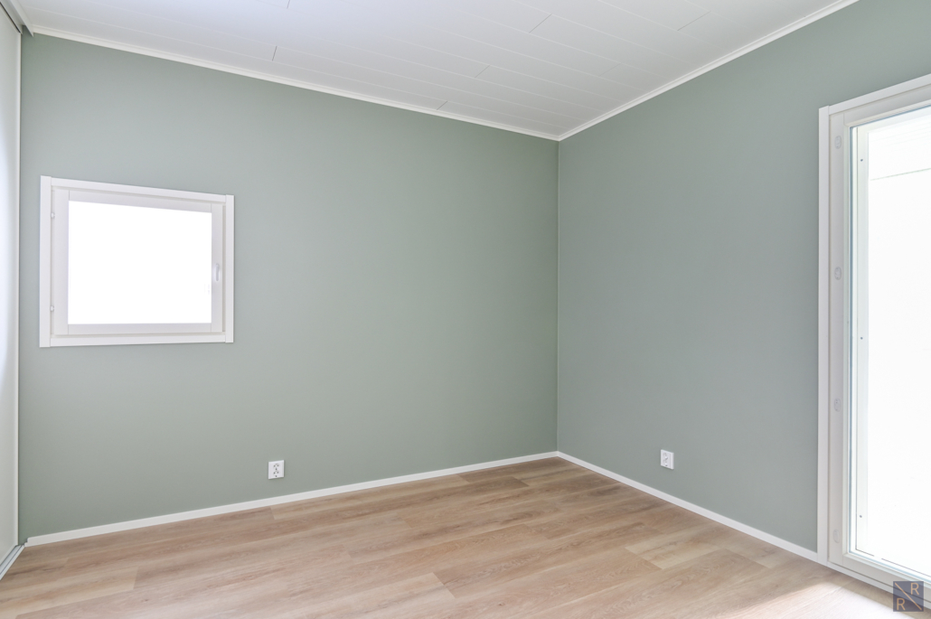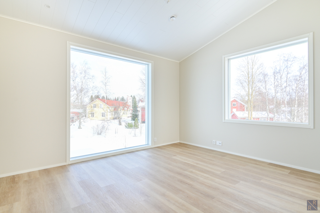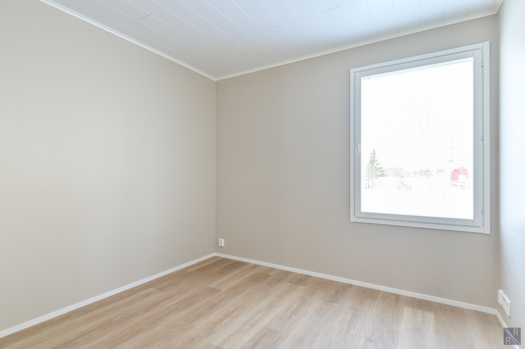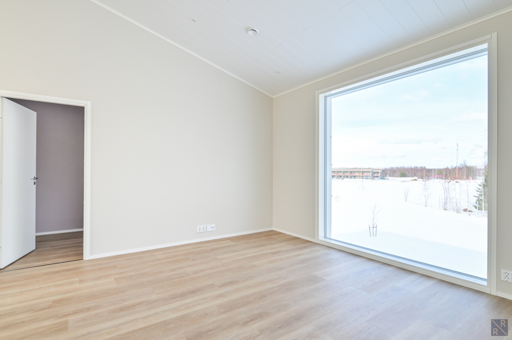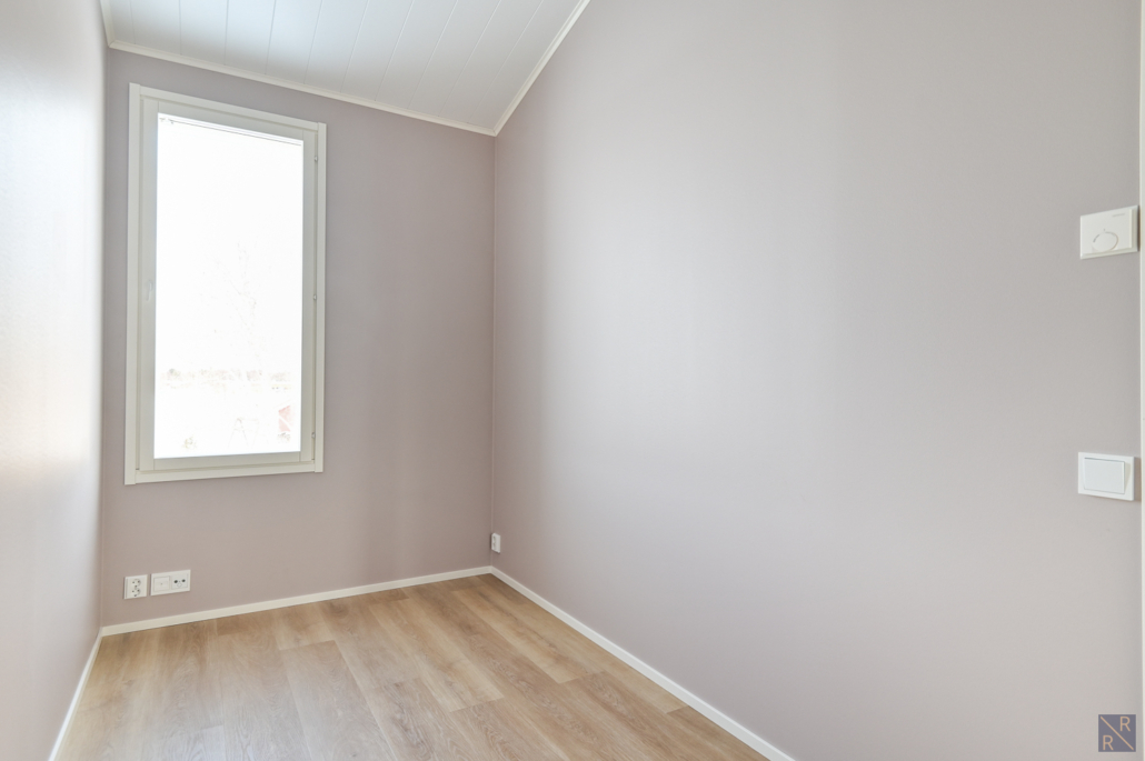 Yksi makuuhuone ylhäällä, kolme alakerrassa. Säilytykseen kaapistot, sekä vaatehuone.