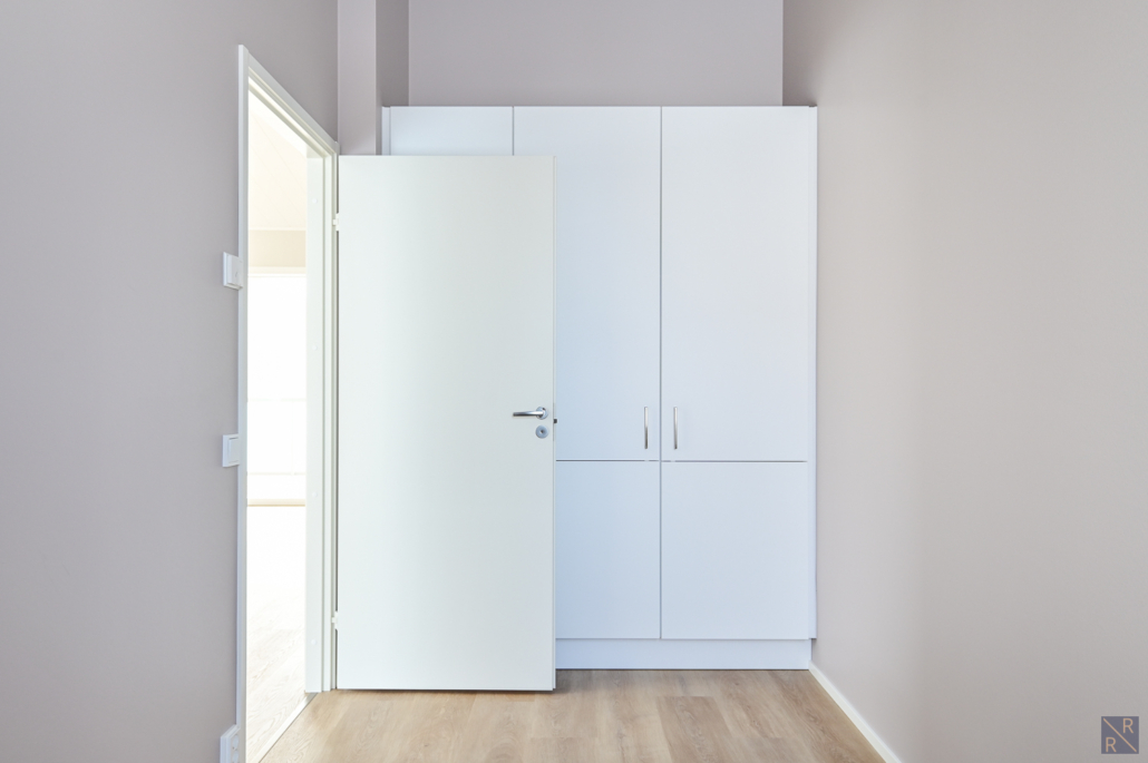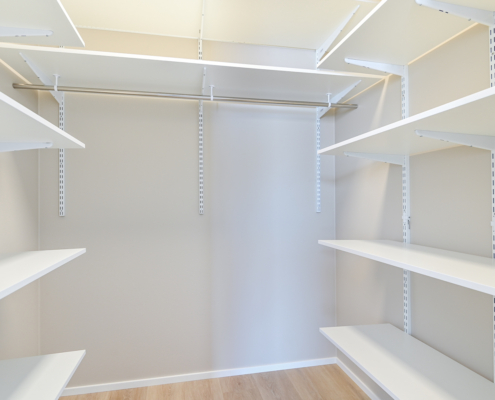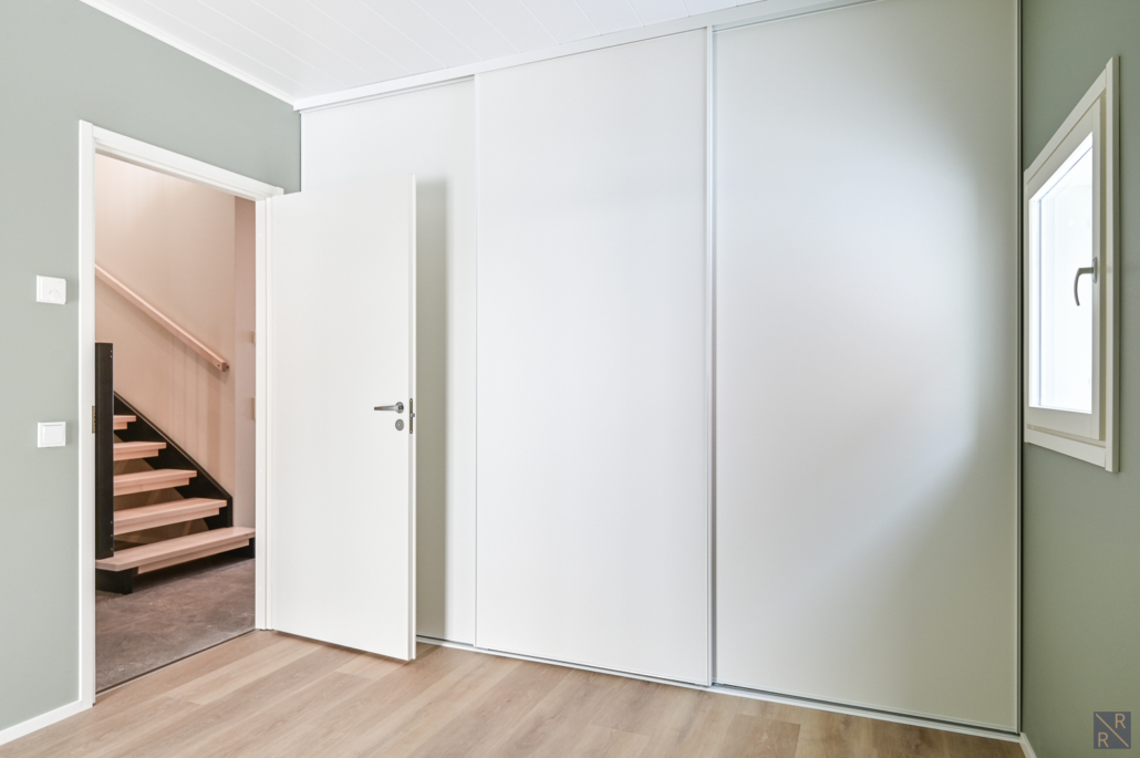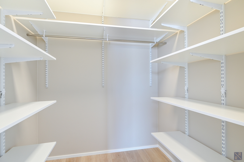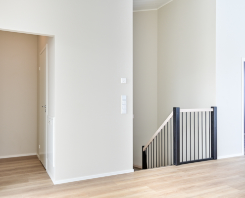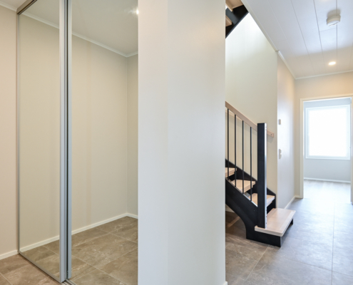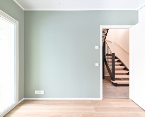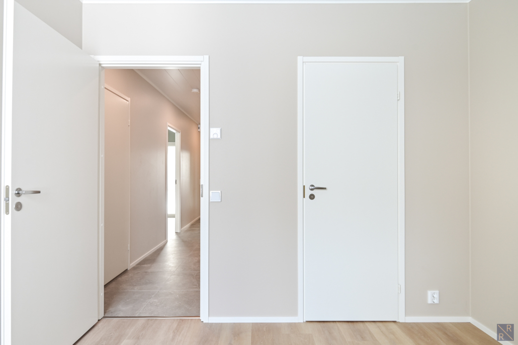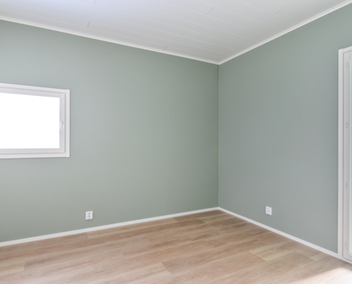 Yksi makuuhuone ylhäällä, kolme alakerrassa. Säilytykseen kaapistot, sekä vaatehuone.