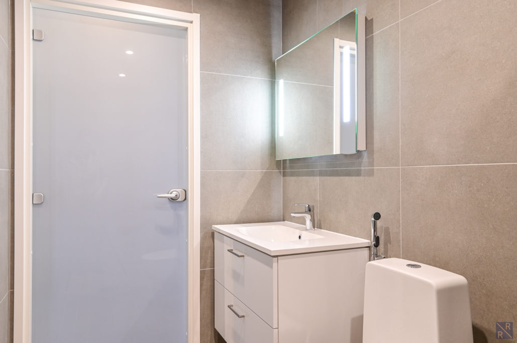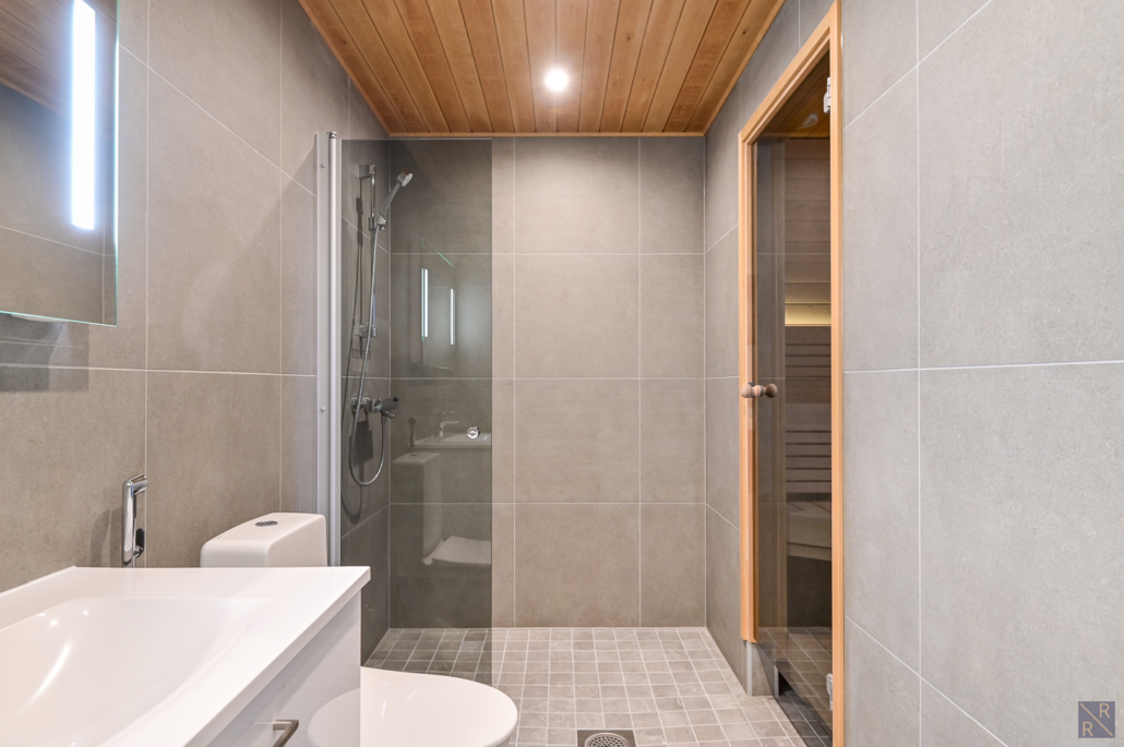 Alakerrassa tyylikäs laattapintainen kylpyhuone ja oma sauna, samassa yhteydessä wc.