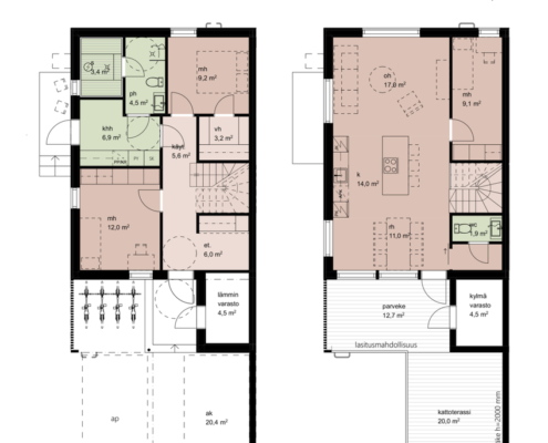 Kaksi irtainvarastoa, toinen lämmin asunnon edustalla ja kylmä, johon käynti parvekkeelta.