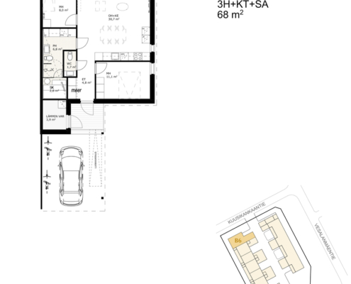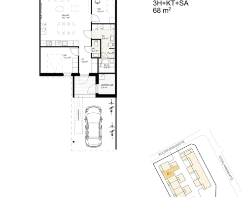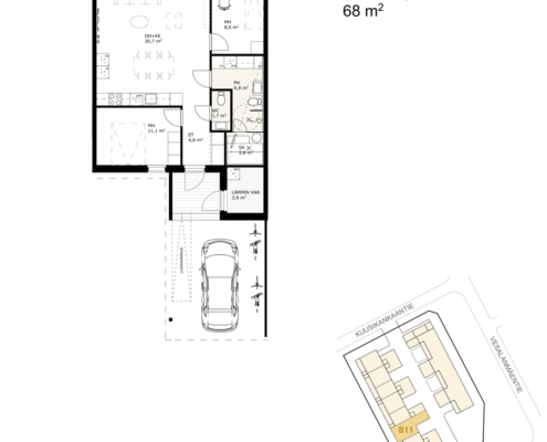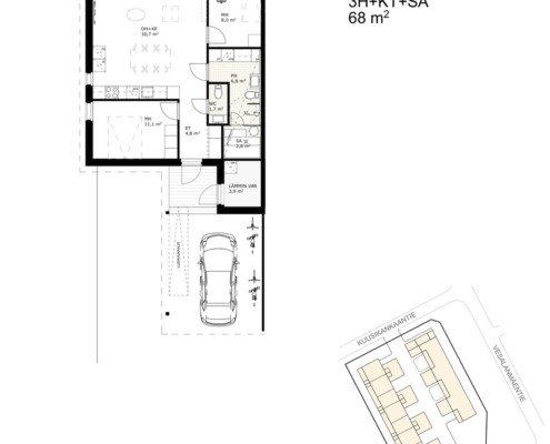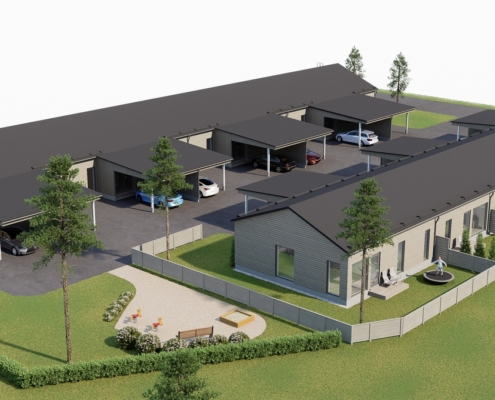 Jokaiselle kodille kuuluu huoneiston yhteyteen sijoittuvat autokatos- ja pihapaikat sekä varasto. Sähköauton latauspiste on saatavilla tarvittaessa lisätyönä.