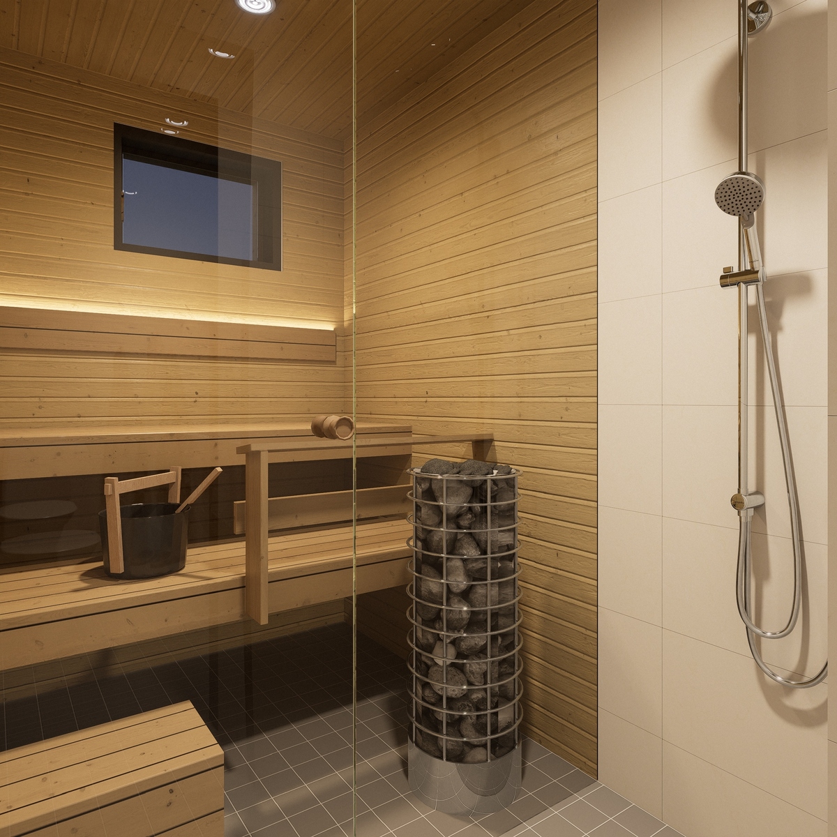 Yläkertaan sijoittuvat kaksi makuuhuonetta, joista toisessa on suuri vaatehuone tuomassa reilusti säilytystilaa. Saunaosasto kodinhoitotiloineen ja wc:ineen tekee arjesta käytännöllistä ja mukavaa.