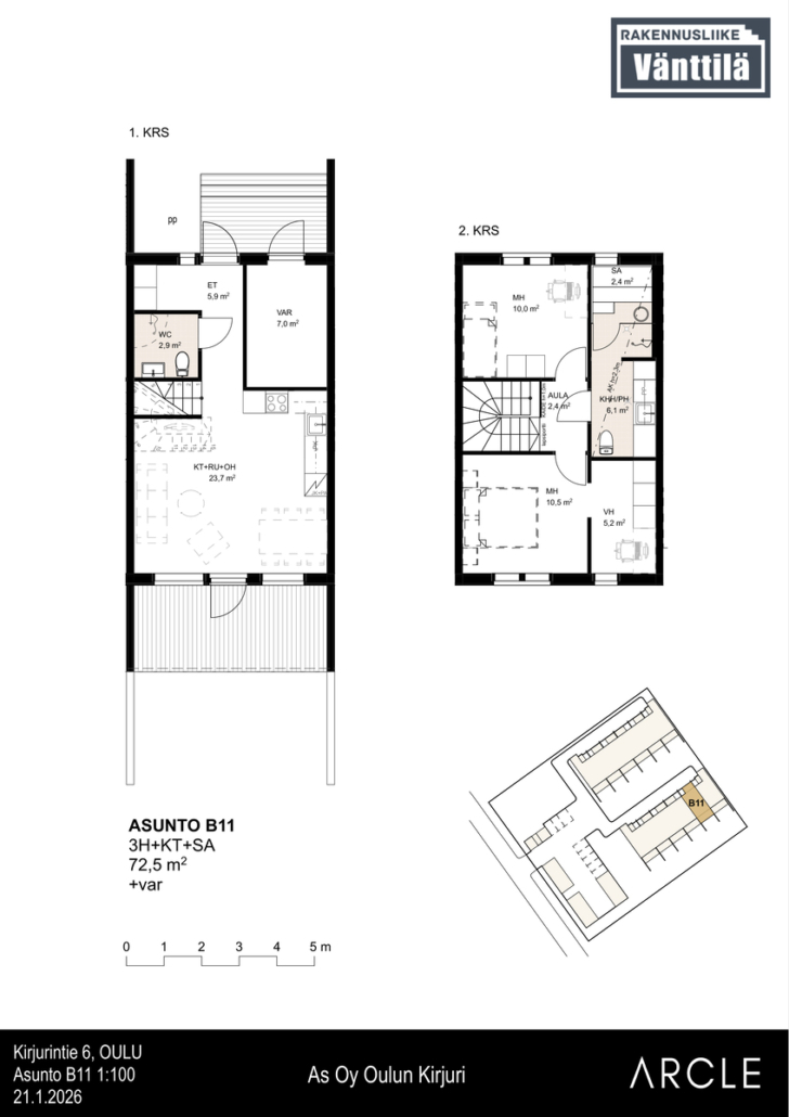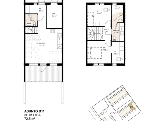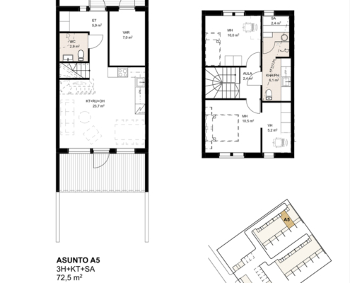 Toimivapohjainen kolmio kahdessa tasossa 72,5 m² – kompakti mutta tilava koti – Kirjurintie 6 :ssa.