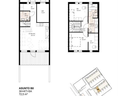 Samalla pohjalla asunnot A2, A5 ja B8, B11.