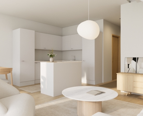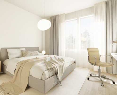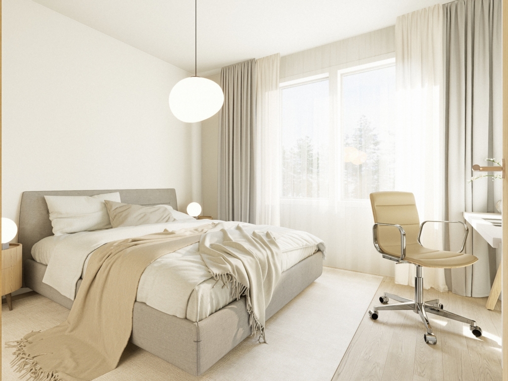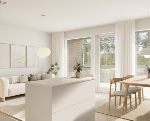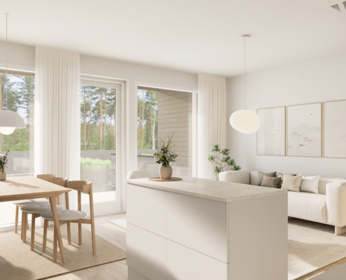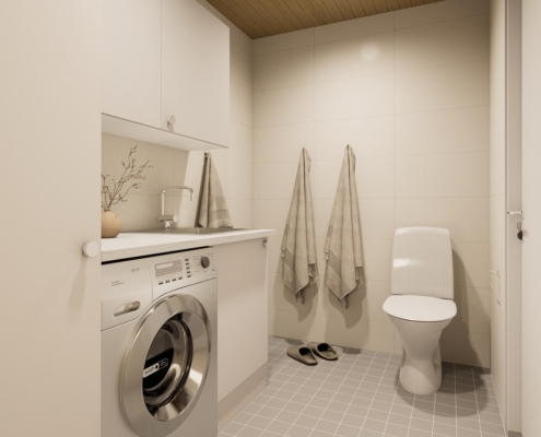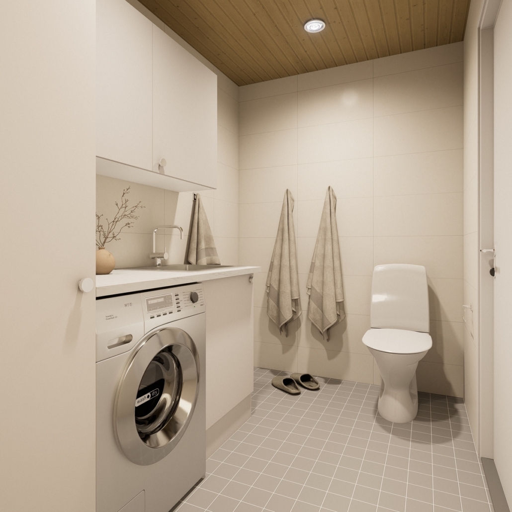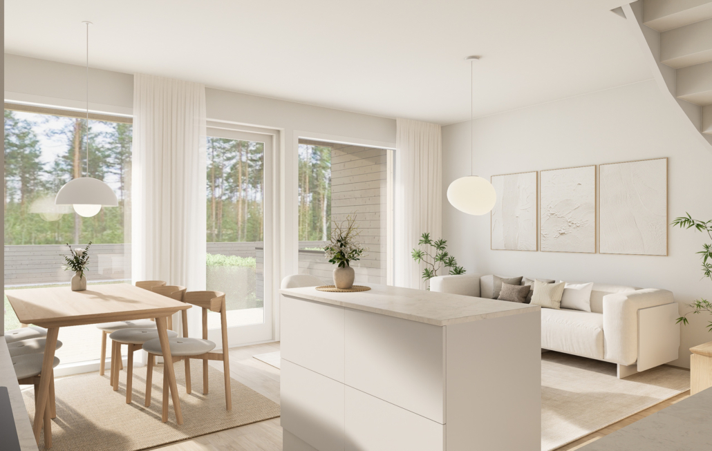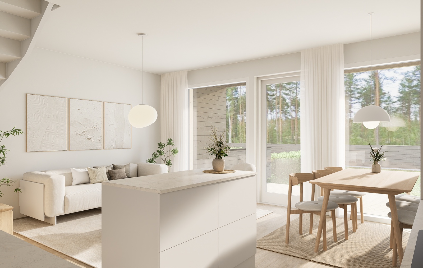 Alakerran avara olohuone ja keittiö muodostavat kodin sydämen – täällä kokataan yhdessä, vietetään perhe-iltoja ja nautitaan arjen pienistä hetkistä. Olohuoneesta on käynti katetulle terassille ja omalle pihalle, jossa lapset voivat leikkiä turvallisesti ja kesäillat venyä pitkiksi. Terassi on mahdollista lasittaa, jolloin saat lisätilaa keväästä syksyyn. Alakerrassa sijaitsee lisäksi yksi makuuhuone, joka sopii mainiosti esimerkiksi työhuoneeksi tai vierashuoneeksi, sekä erillinen wc.