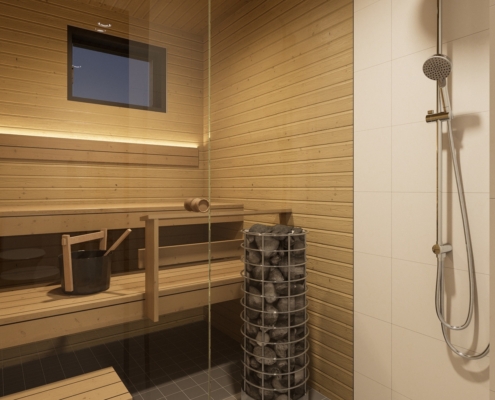 Yläkerta tarjoaa rauhallisen tilan perhe-elämälle. Kolme makuuhuonetta mukautuvat joustavasti eri elämäntilanteisiin. Oma saunaosasto kodinhoitotiloineen ja wc:ineen tekee arjesta sujuvaa ja käytännöllistä.
