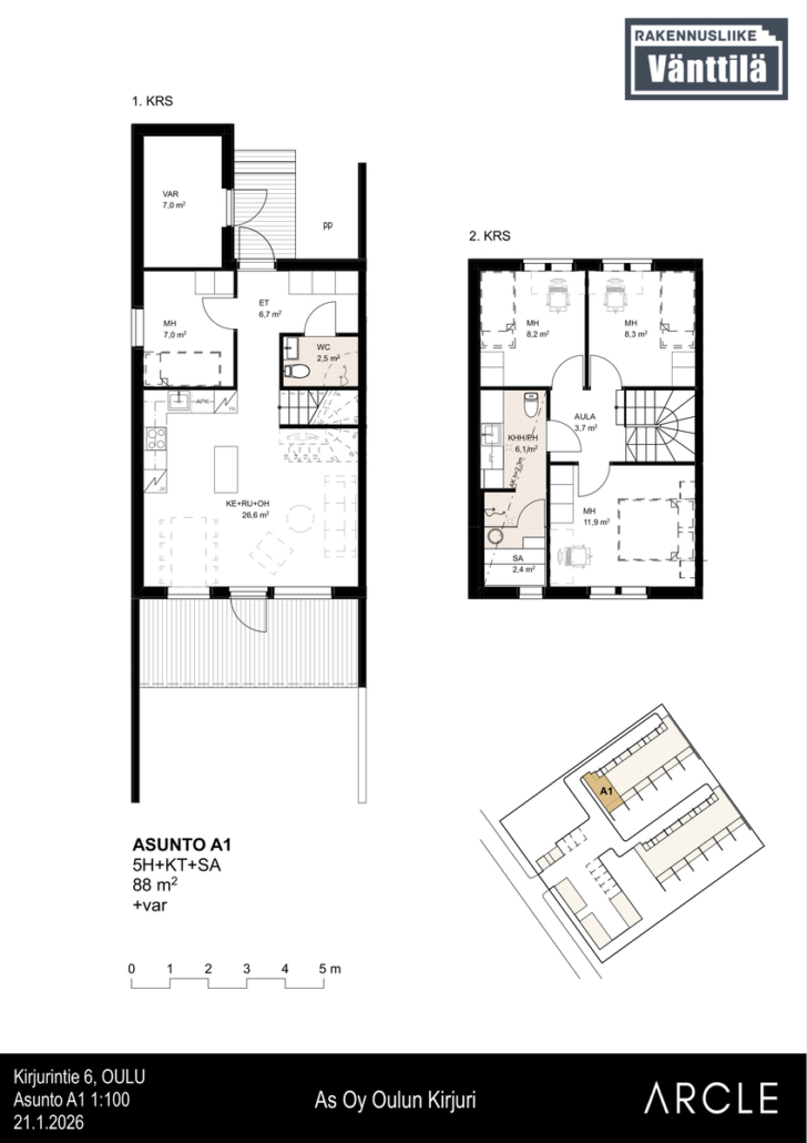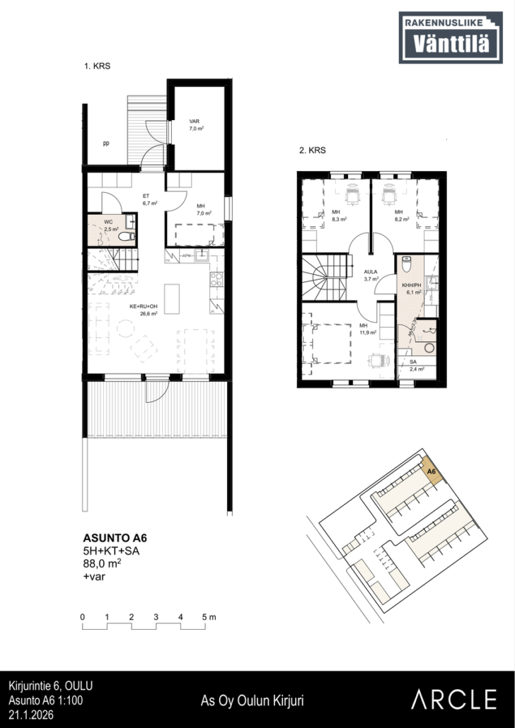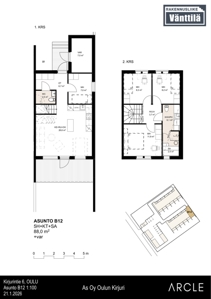 Asunto-osakeyhtiö Oulun Kirjuri rakentuu viihtyisälle ja kehittyvälle Hiukkavaaran alueelle. Tämä moderni, 12 kodin rivitalokokonaisuus tarjoaa tasapainoista asumista luonnon ja palveluiden läheisyydessä. Jokaisessa asunnossa on oma viheraidattu piha terasseineen, kaukolämpöön liitetty vesikiertoinen lattialämmitys sekä viilentävä ilmalämpöpumppu. Katettu autokatospaikka sähköauton latausvarauksella sisältyy hintaan.