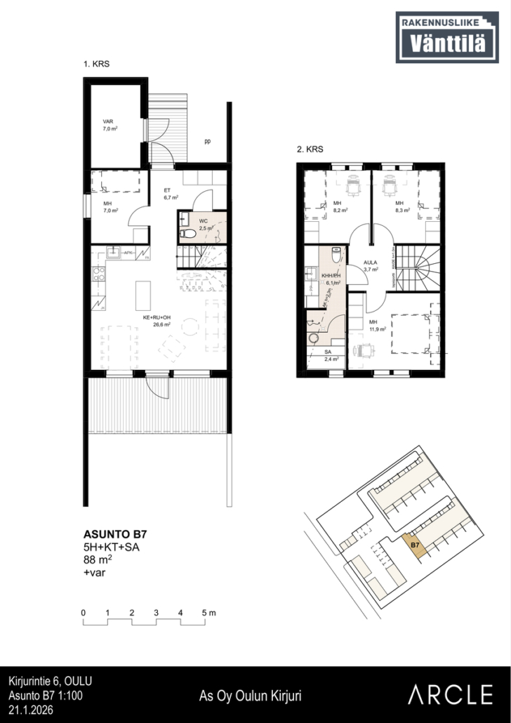 Upea viiden huoneen kokonaisuus 88 m2 – kaksitasoinen päätyasunto Kirjurintie 6:ssa.